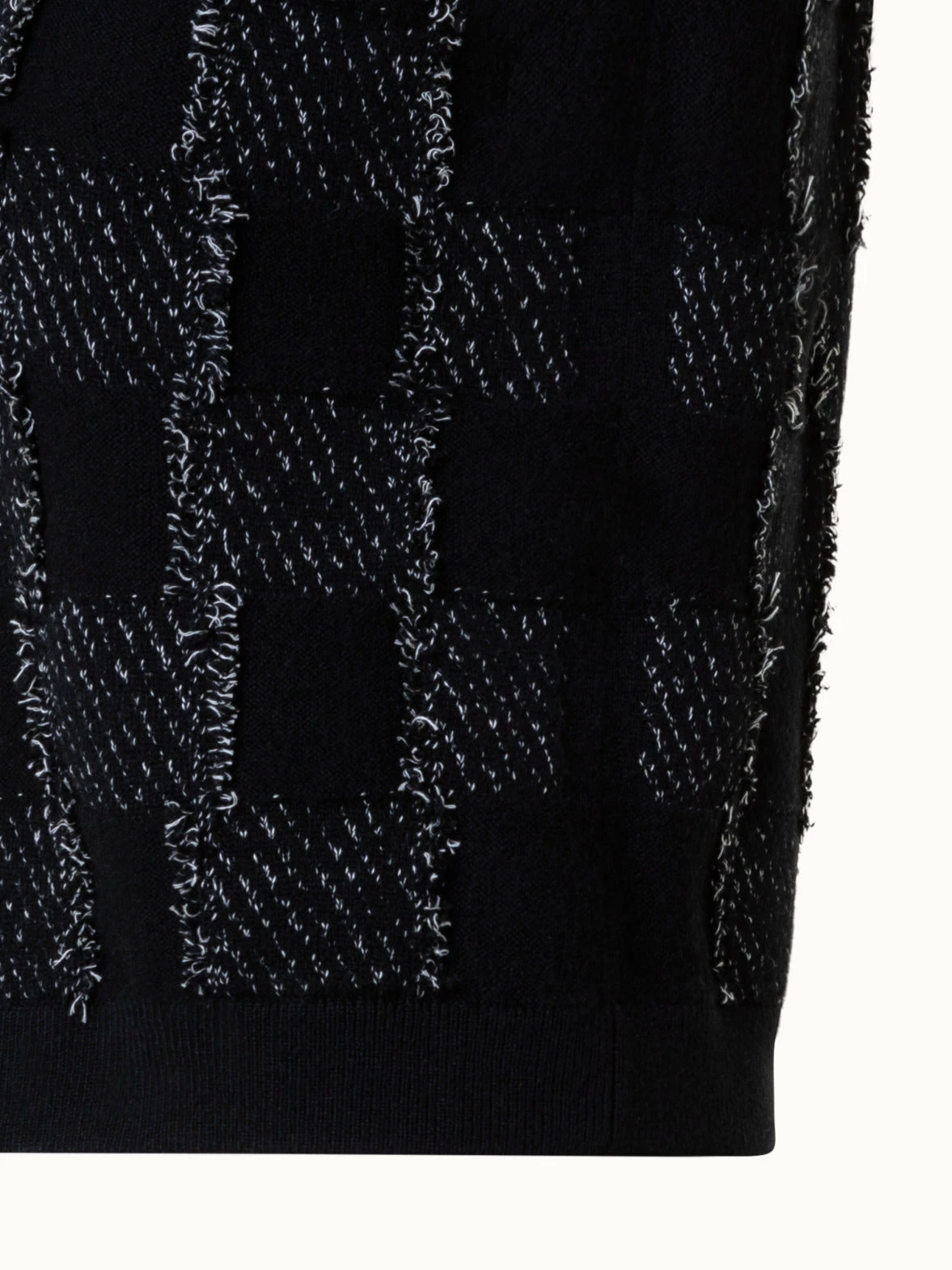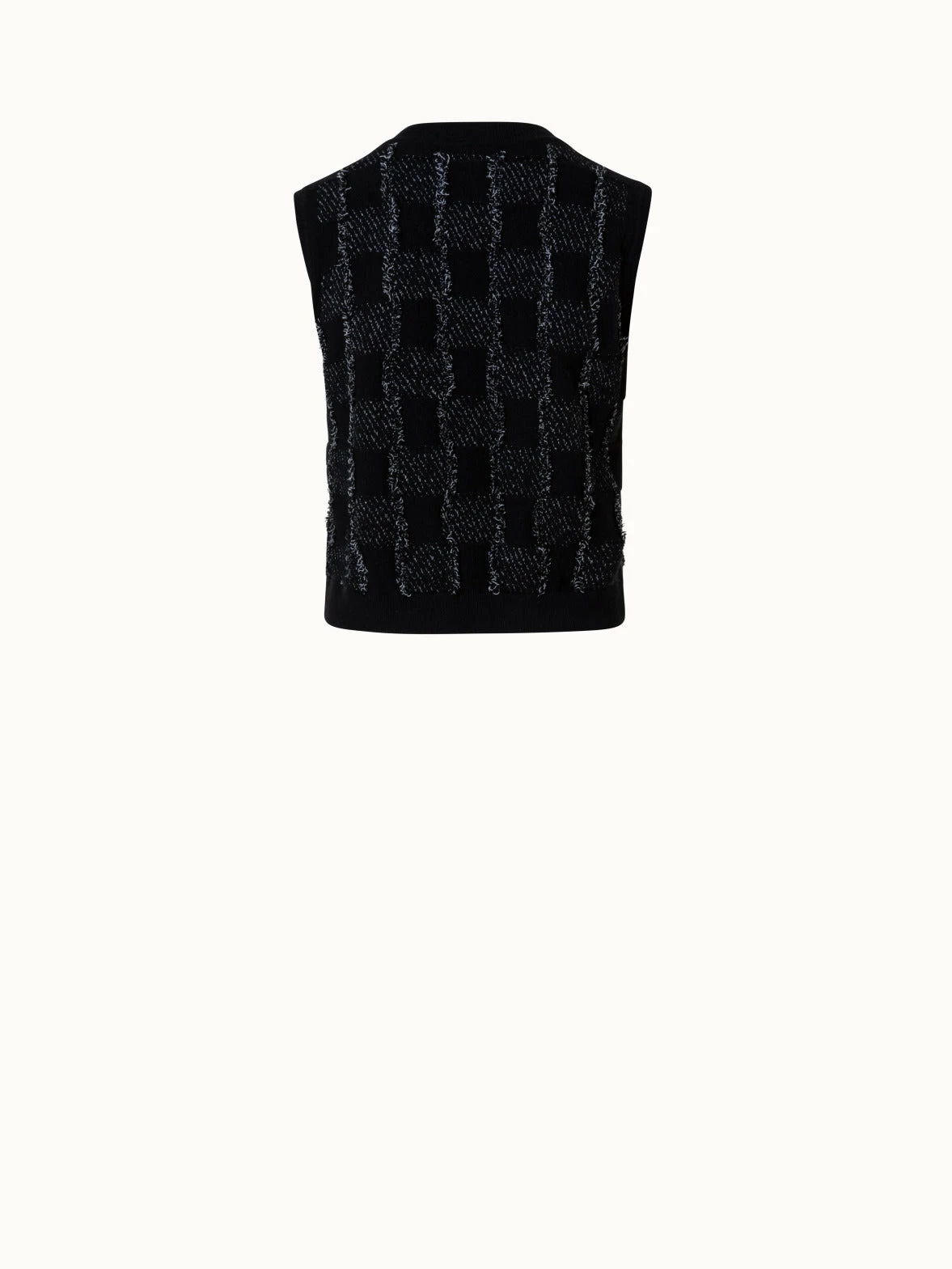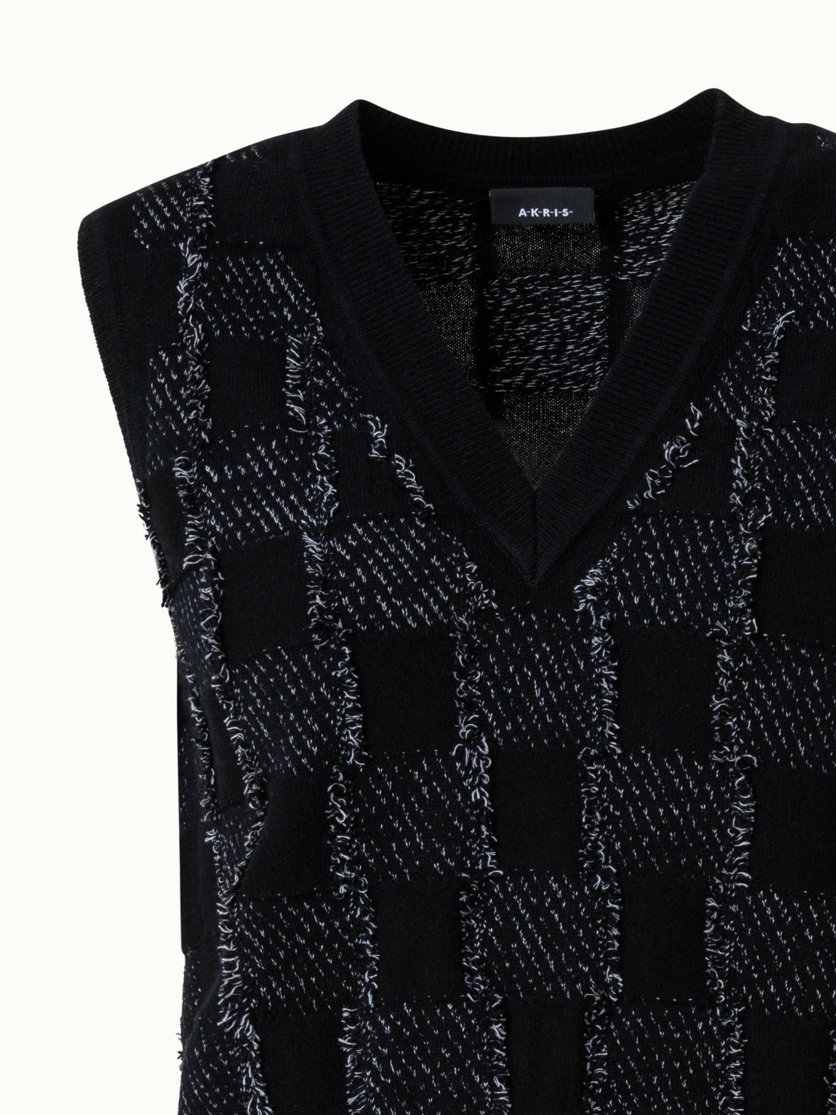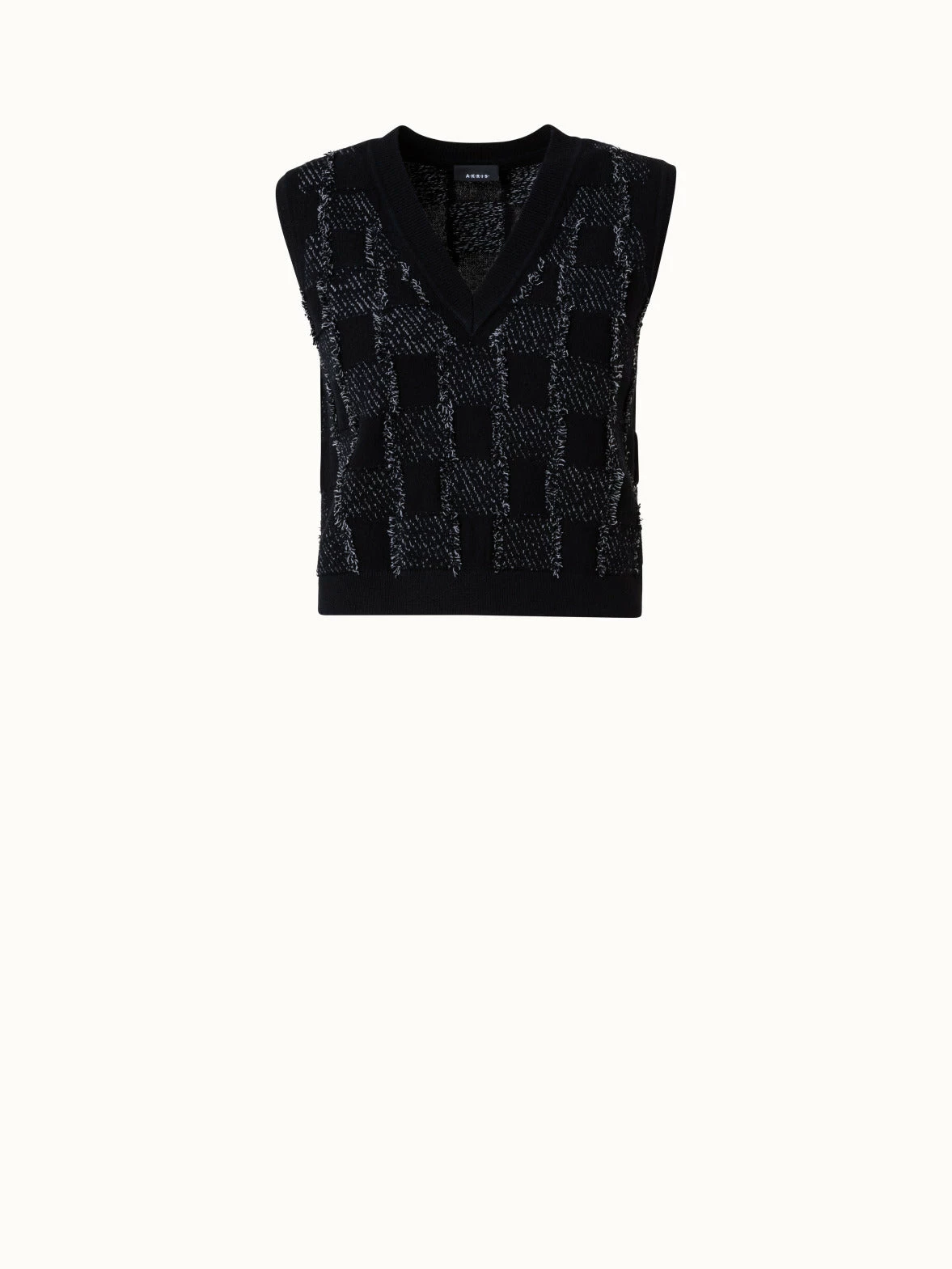 This knit vest is crafted in a cashmere cotton jacquard with square fringes. Cut with a deep V-neck and cropped body, this vest styles beautifully over shirts or as a standalone piece.