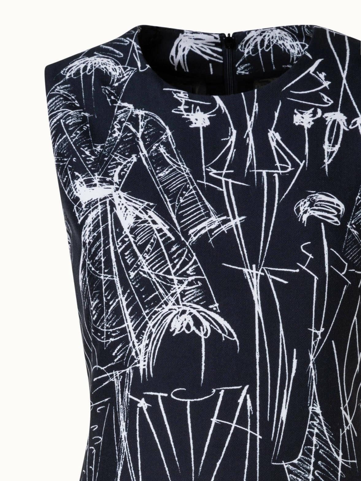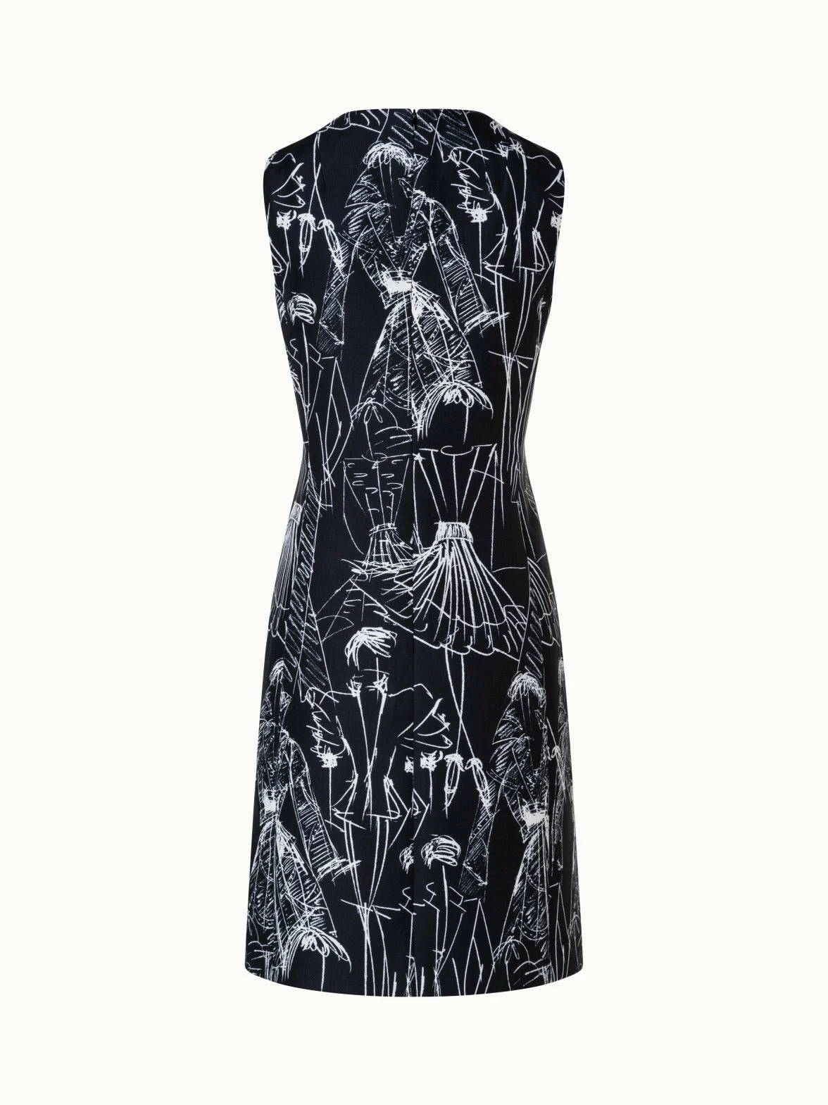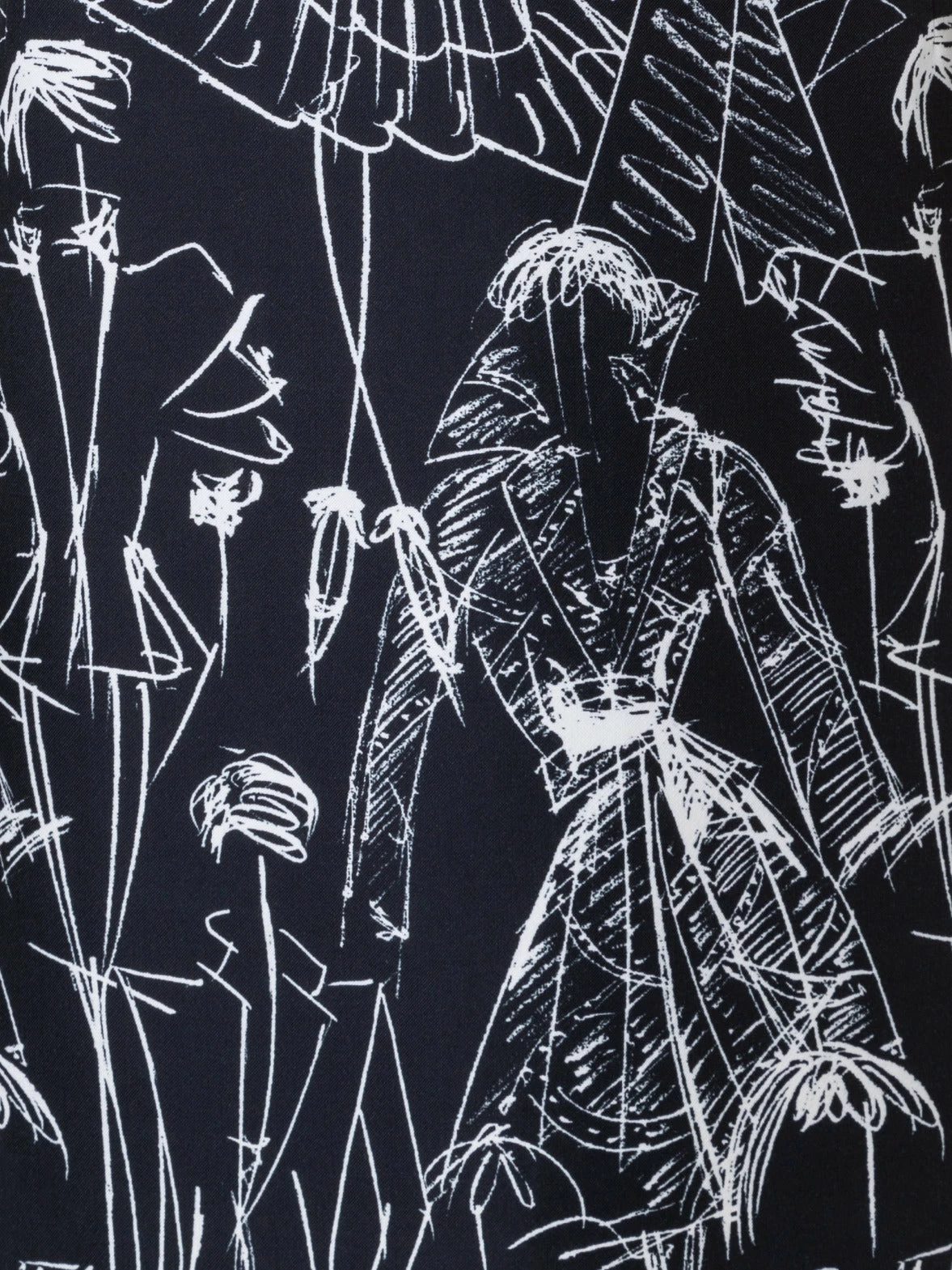 Displaying sketches by creative director Albert Kriemler, the Croquis print showcased on this sheath dress of Akris Spring 2023 tells a very personal story. Witty and charming, it was designed by his team as an anniversary surprise.