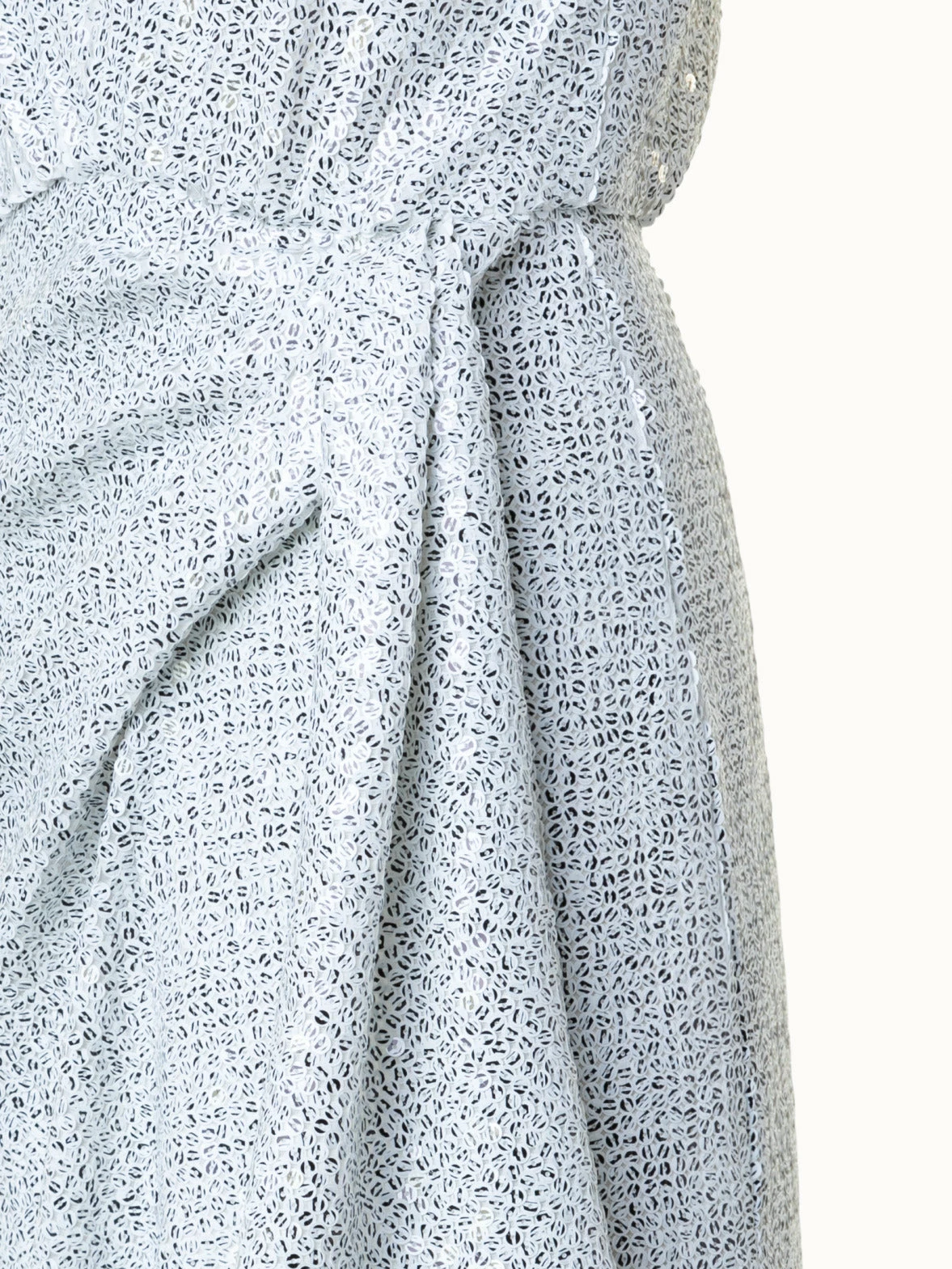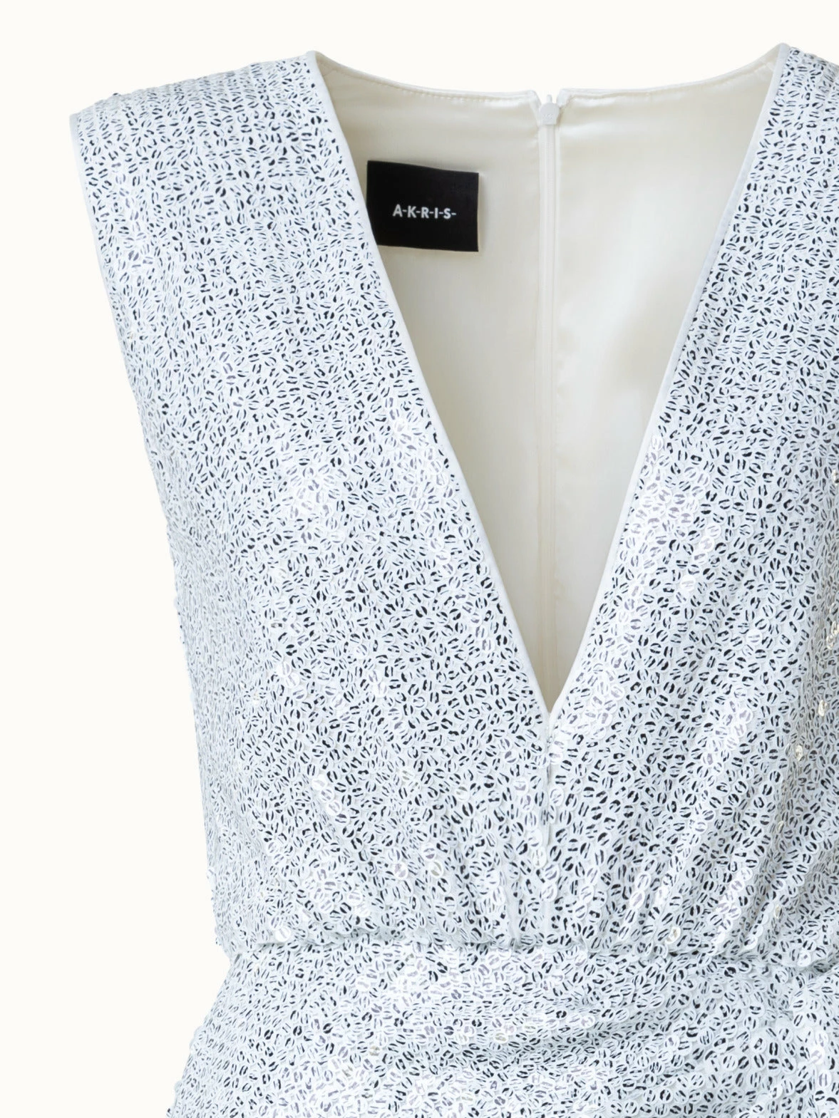 This Akris dress will make you stand out. Crafted in two-tone sequins on tulle stretch, it creates a unique look while ensuring comfort on any occasion. Shoulder pads showcase the vintage inspiration of the Spring 2023 collection and create a strong look. The deep V-neck and skirt with asymmetrical overlayer create a feminine silhouette.