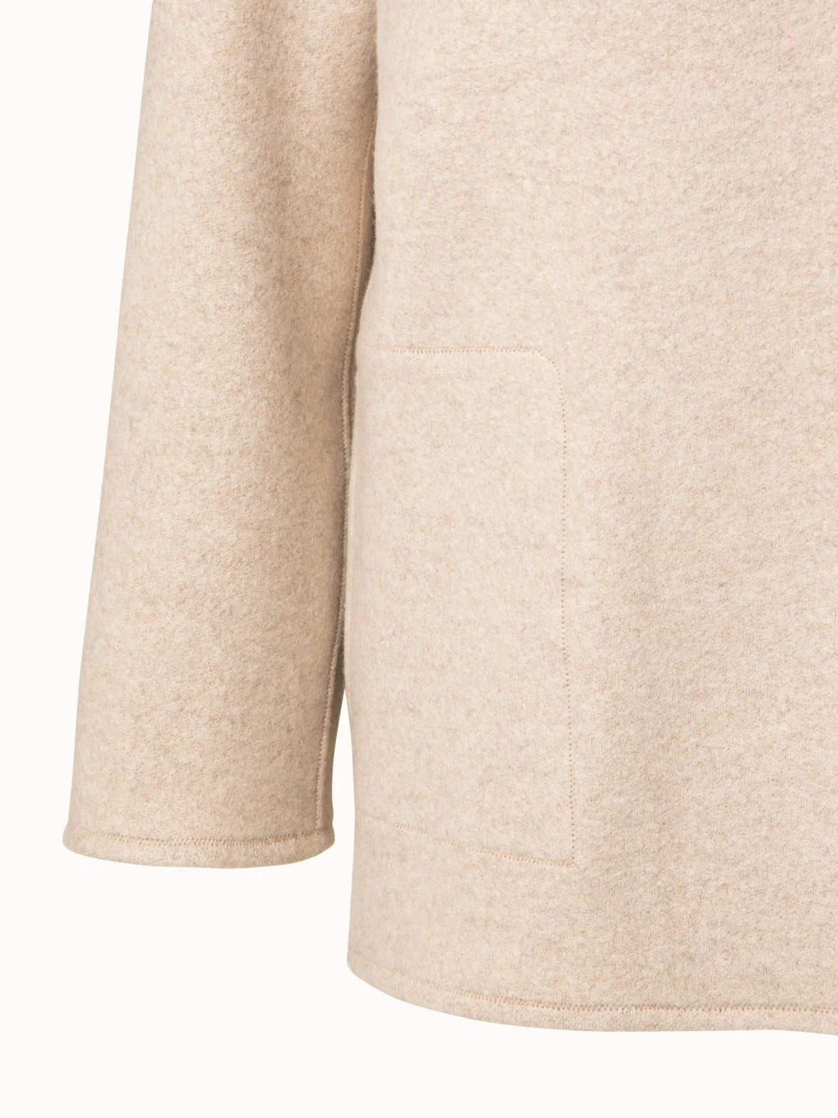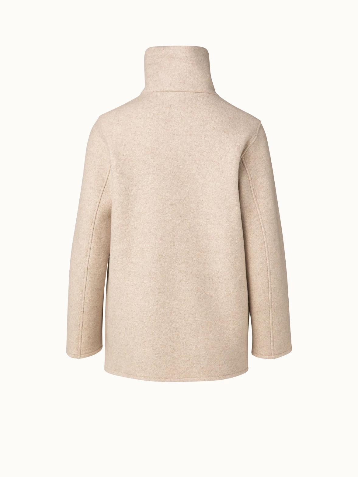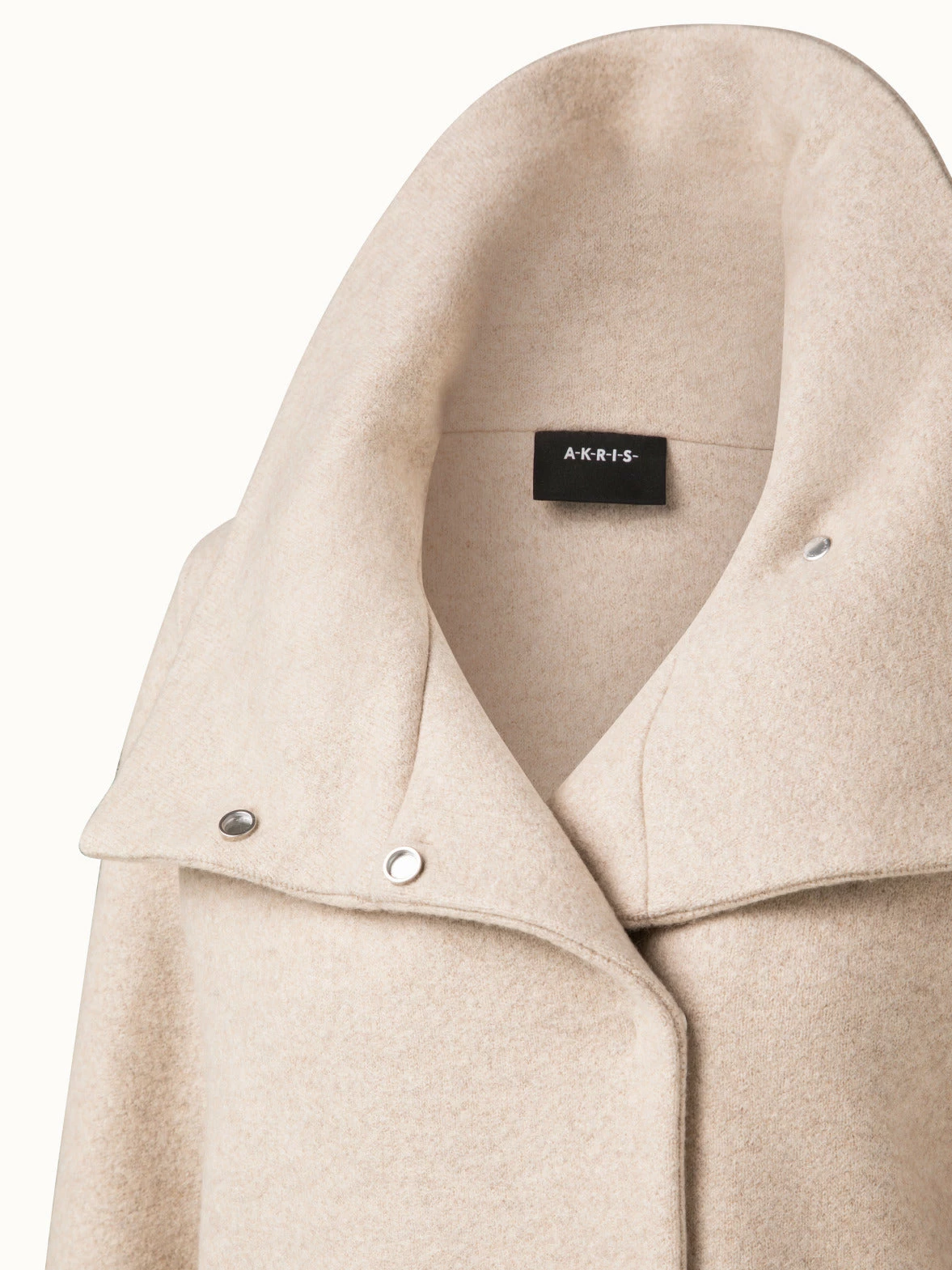 This casual, oversized cashmere jersey jacket feels like a cozy cocoon on your body. Designed with a stand up collar, snap closure with trapezoid metal buckle, pockets, and slightly longer back hem.