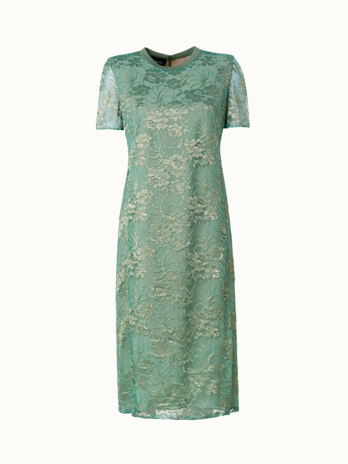 This Akris dress is crafted in all-over floral lace with subtle two-tone coloring. The dress features a round neck and short sleeves. The body is fully lined. Closes with a back zip.