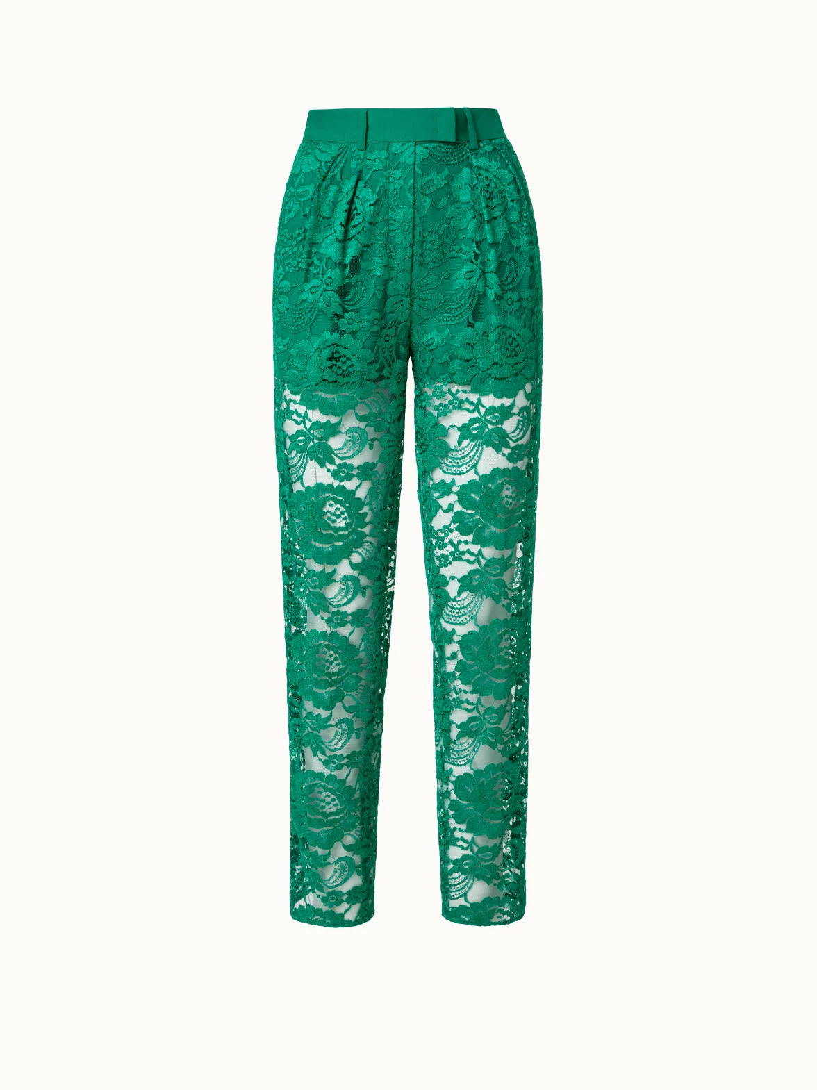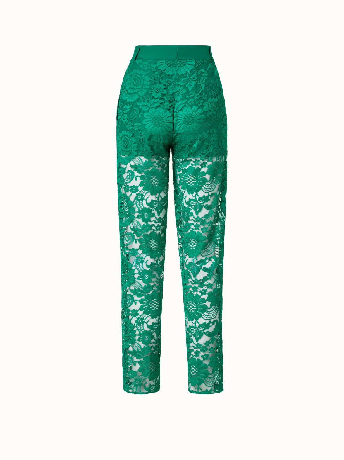 The Akris pants Fidelia are a revival of a vintage silhouette by creative director Albert Kriemler from the 1980s. It features a slightly tapered leg, creating a sleek shape. Waist pleats are a tailoring detail that ensures comfort while adding structure. These pants are crafted in a floral lace and feature a short lining, creating a stand-out style for warm weather occasions.