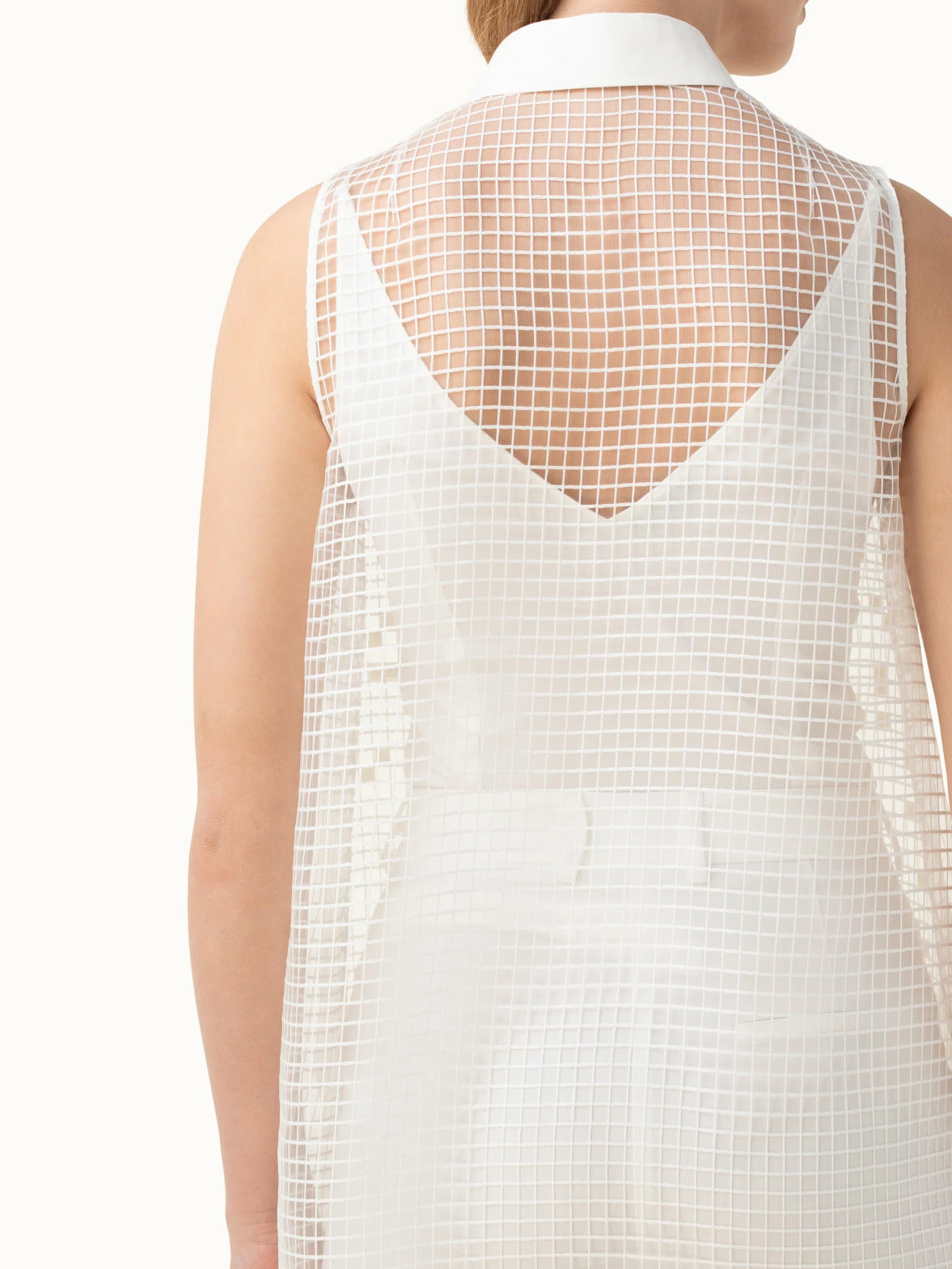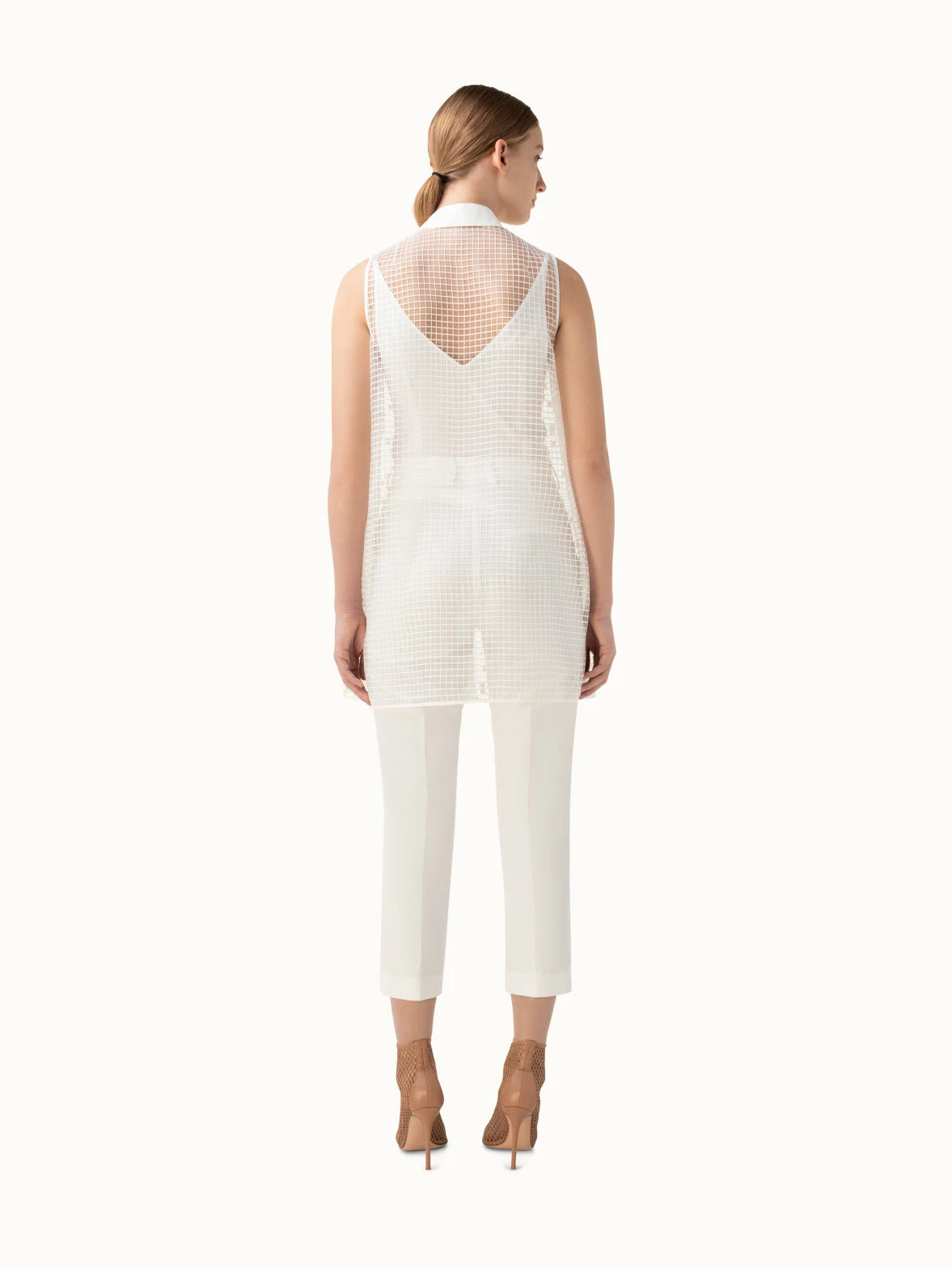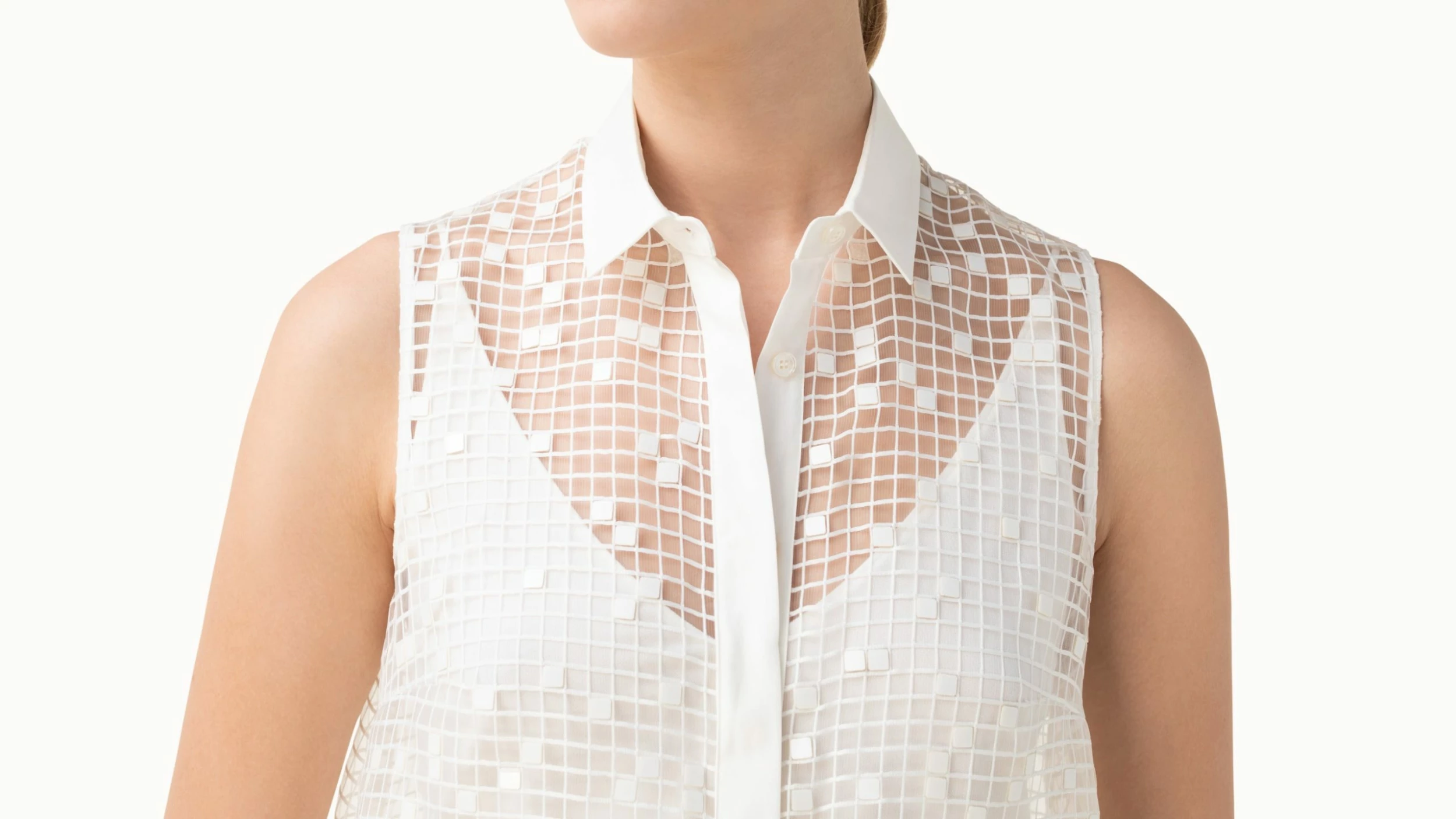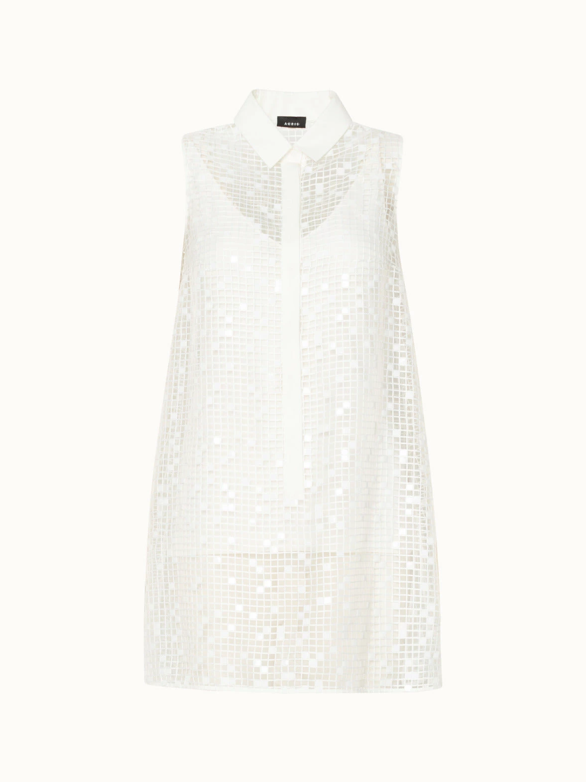 This long tunic in a polyester foil grid fabrication has a relaxed and dressy spirt. The sleeveless style features a shirt collar, button front, and includes a silk double v-neck tank. Perfectly crisp and elegant with a slim white pant.
