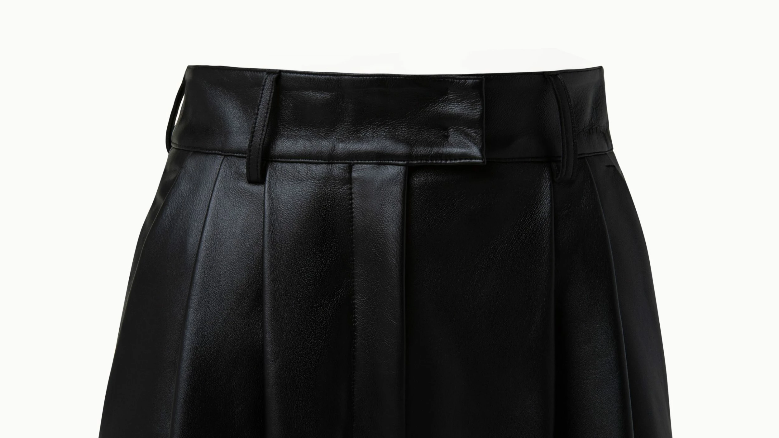 The front pleats of these leather shorts give them a flattering fit. Chic and of the moment, these trendy shorts will seamlessly ease you from winter to spring. Features a front closure and cuffs.