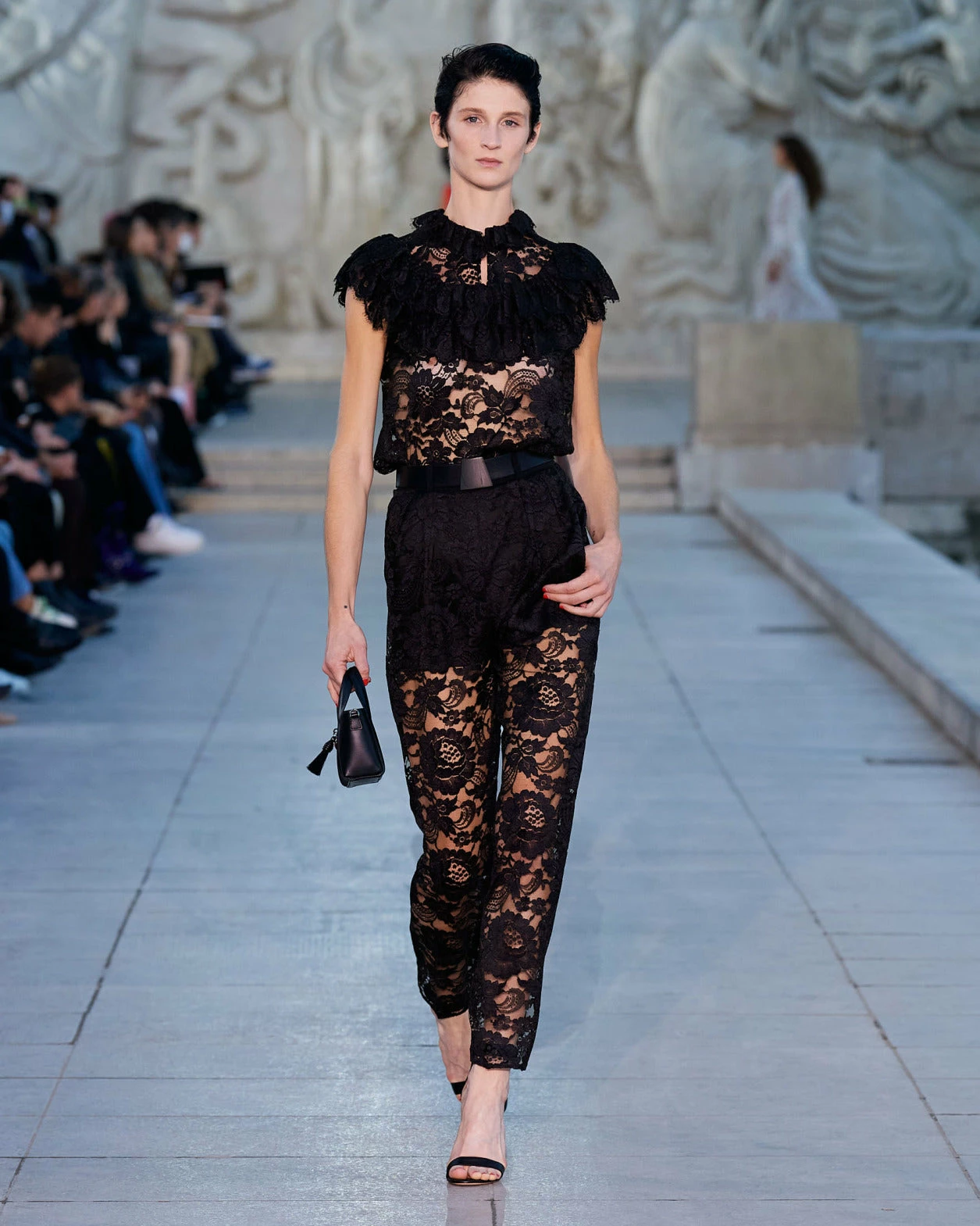 As part of the vintage inspiration of Akris Spring 2023 and the celebration of 100 years Akris, the lace in this collection originates from creative director Albert Kriemler’s designs of the 1980s. They are manufactured by the initial lacemaker in Calais and were re-developed in a six-month process.