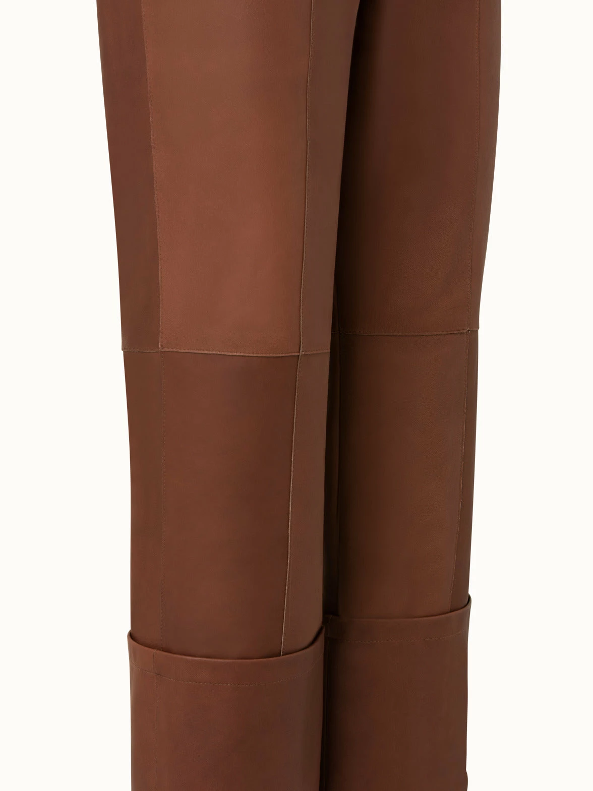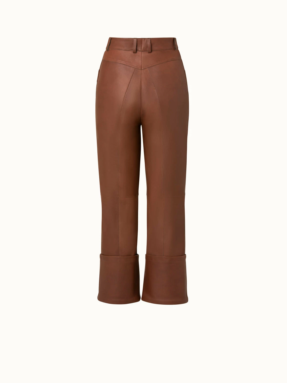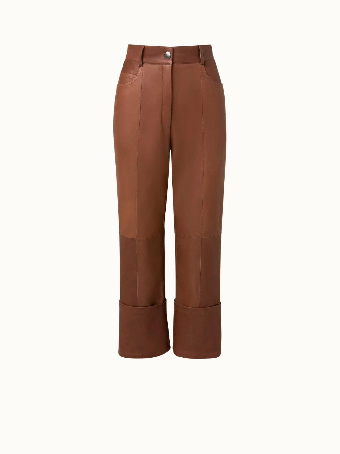 These Akris Floyd pants are crafted in subtle lamb Nappa leather. They feature a high waist and wide leg with turned-up hem. The front closure, belt loops, and five pockets are reminiscent of a jeans design