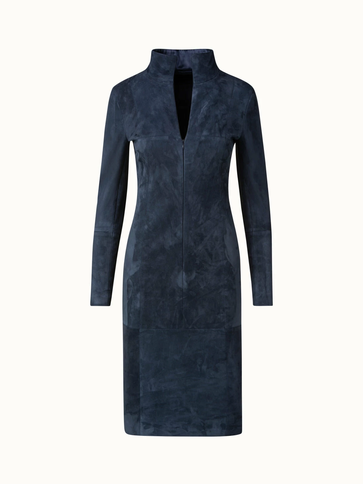 This Akris lamb stretch suede sheath dress is the most luxurious version of the iconic silhouette yet. It features a front zip that creates a versatile neckline and a mock neck. The long sleeves and knee-length make it ideal for fall and winter.