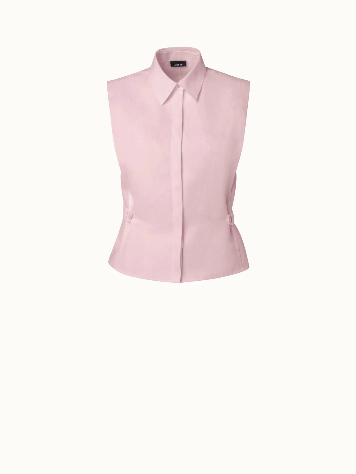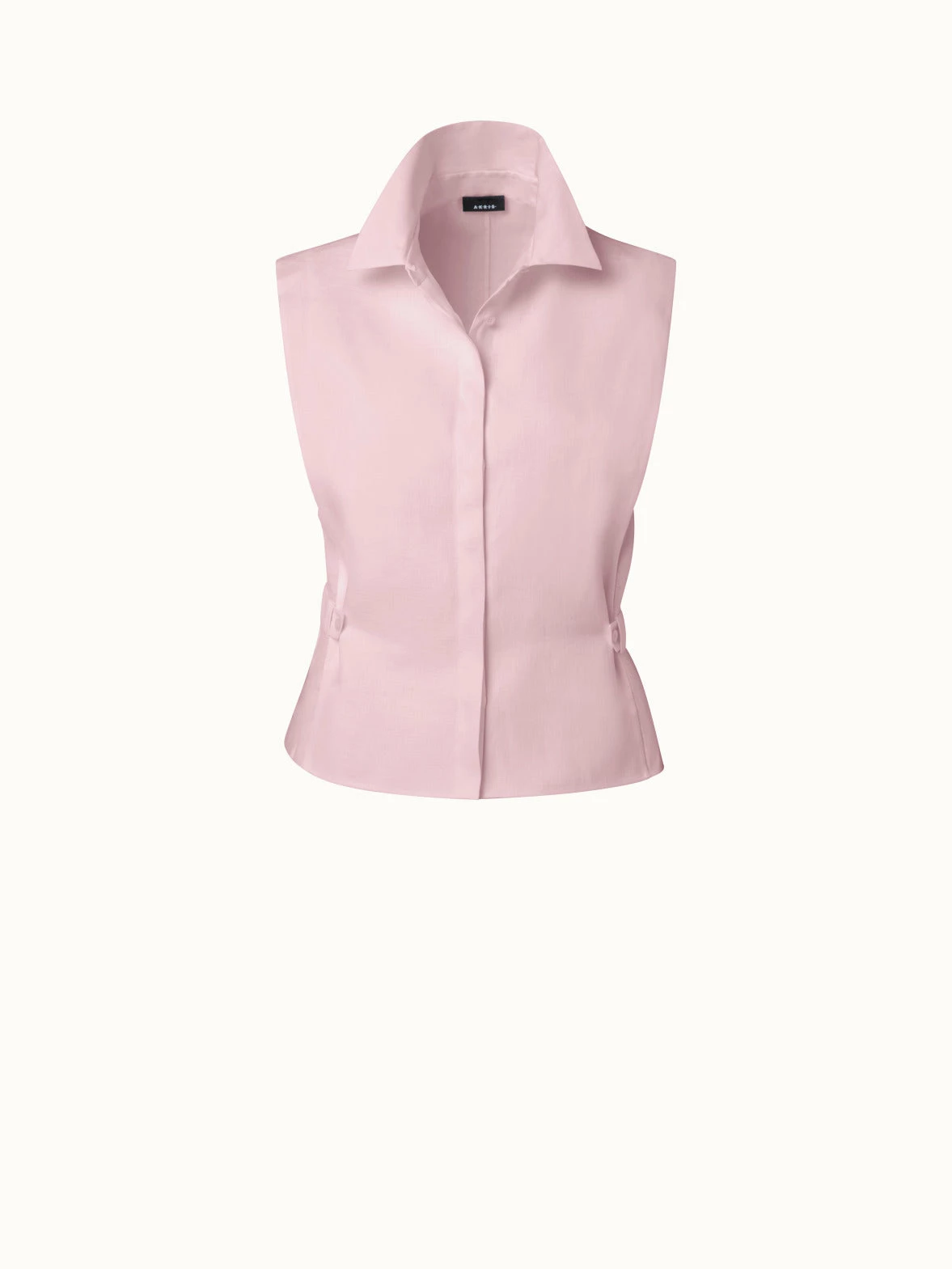 This Akris blouse is crafted in linen voile, giving it a lightweight feel and tactile structure. Inspired by Albert Kriemler’s own designs from the 1980s, it has a powerful shape that takes in the waist with side tabs. The shirt collar and covered button placket complete this sleek silhouette.