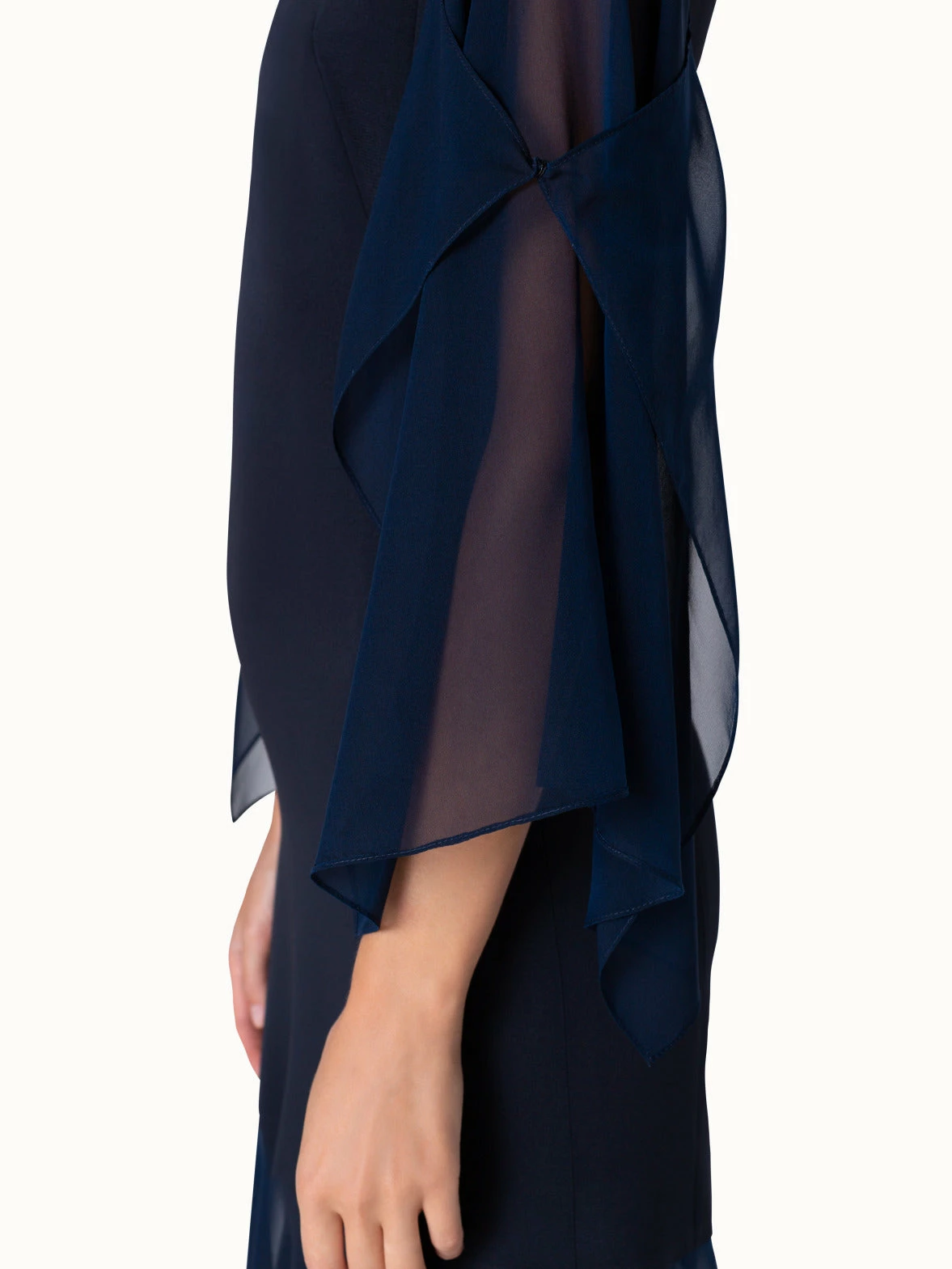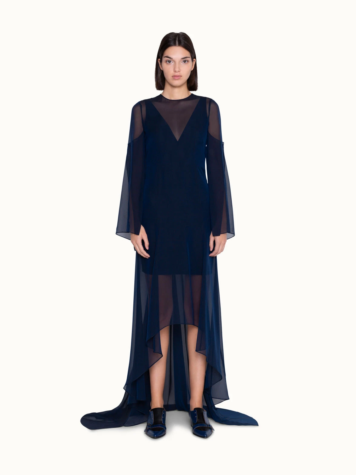 A silk dream. Long Akris designer dress that shows your feminine side without revealing too much. This long silk crepe evening dress has a round neckline and a lower part made of georgette. The A-line shape and the wide sleeves give the dress a feminine lightness and create a flattering silhouette. Are you invited to a wedding as a guest? Float on the dance floor with this dark blue elegant dress. As an accessory we recommend a navy blue small Akris Ai bag or Akris Anouk clutch that can also be worn over the shoulder with a long or short shoulder strap.