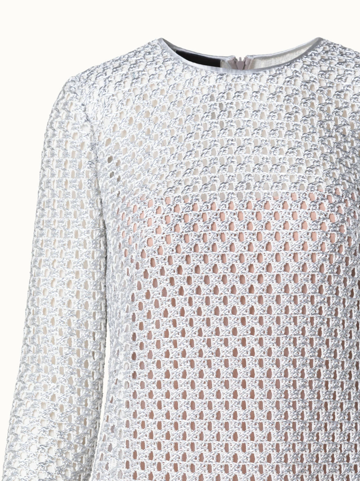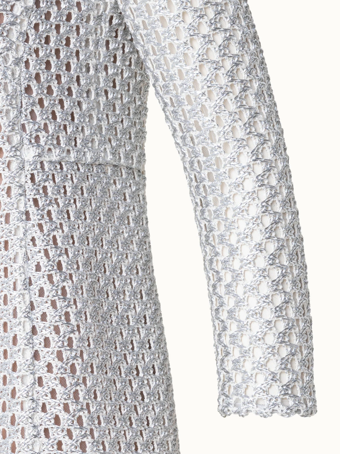 This Akris dress embodies the house’s approach to combining the embroidery history of St. Gallen with modern materials, techniques, and design to create stand-out pieces. This style is crafted in metallic lurex cotton crochet embroidery that simultaneously looks futuristic, cozy, and elegant. The dress features an A-line silhouette, a round neck, and bracelet-length sleeves.