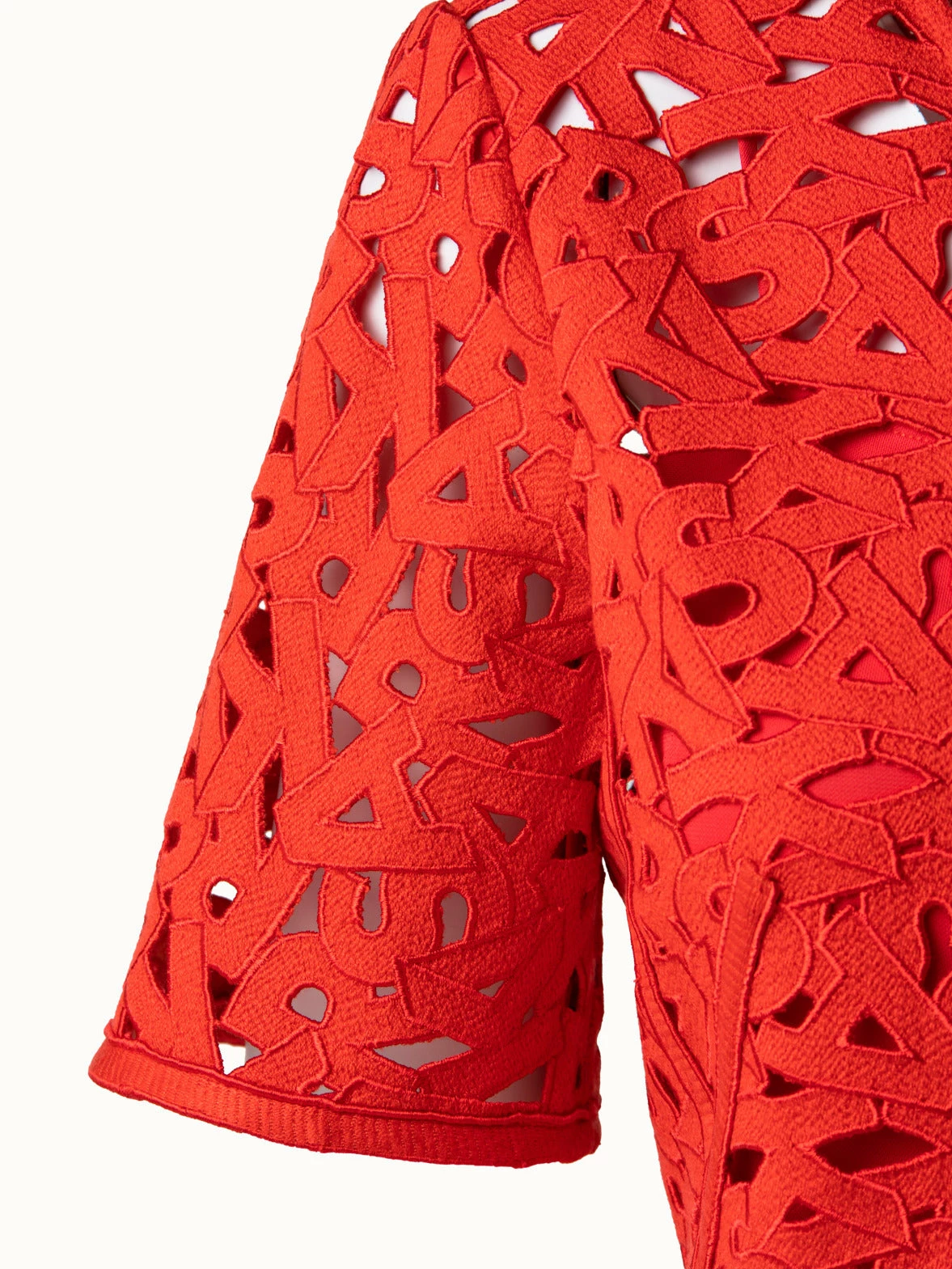 A playful wink to the Akris logo, our second glance embroidery is showcased on this classic sheath dress style. The round neck, cap sleeves, and slight a-line skirt create a feminine silhouette.