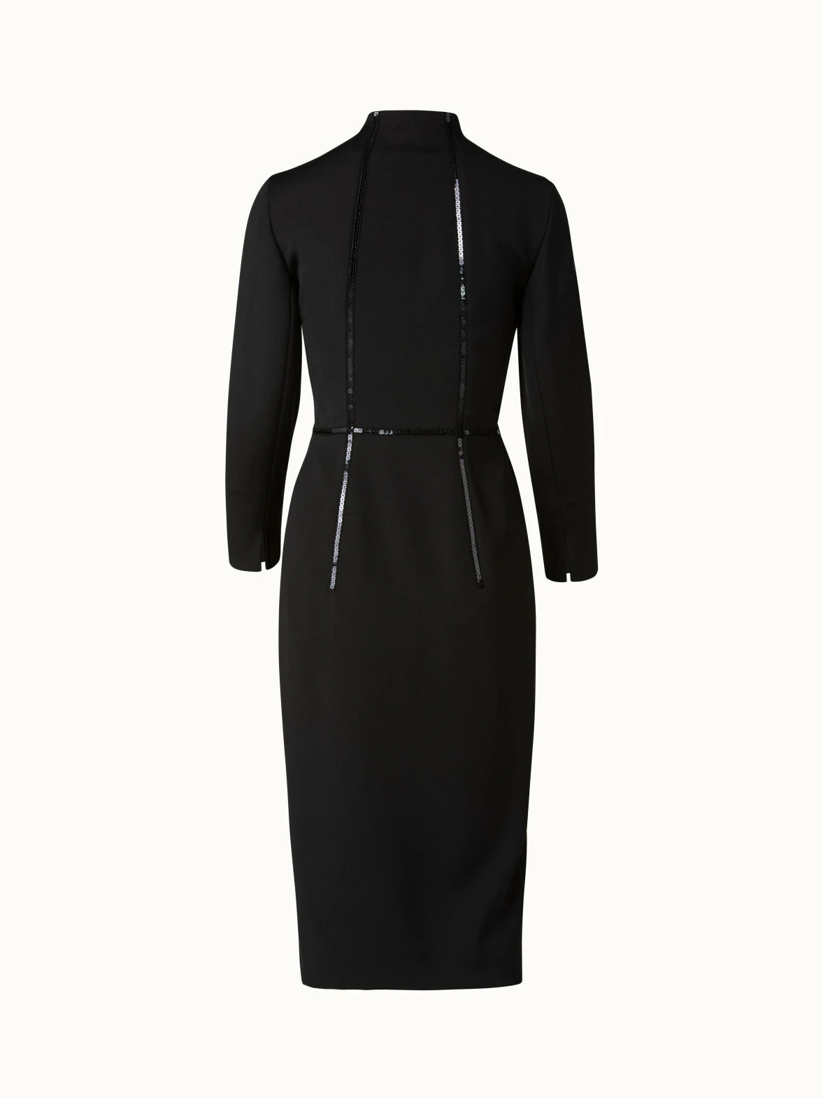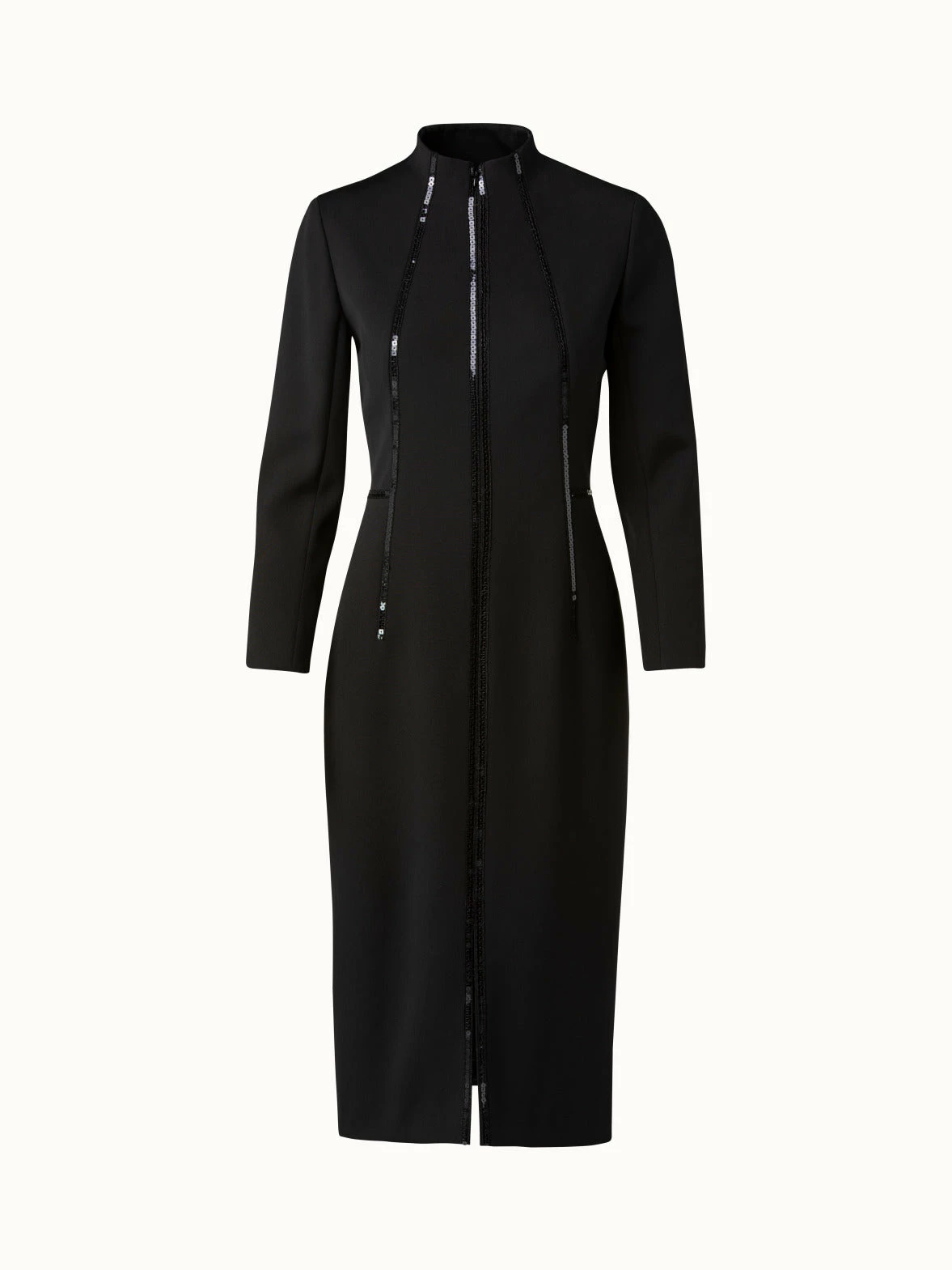 Sequin piping adds a subtle shimmer and geometric touch to this Akris silk crêpe sheath dress. It features a small mock neck with zipper for a versatile neckline.