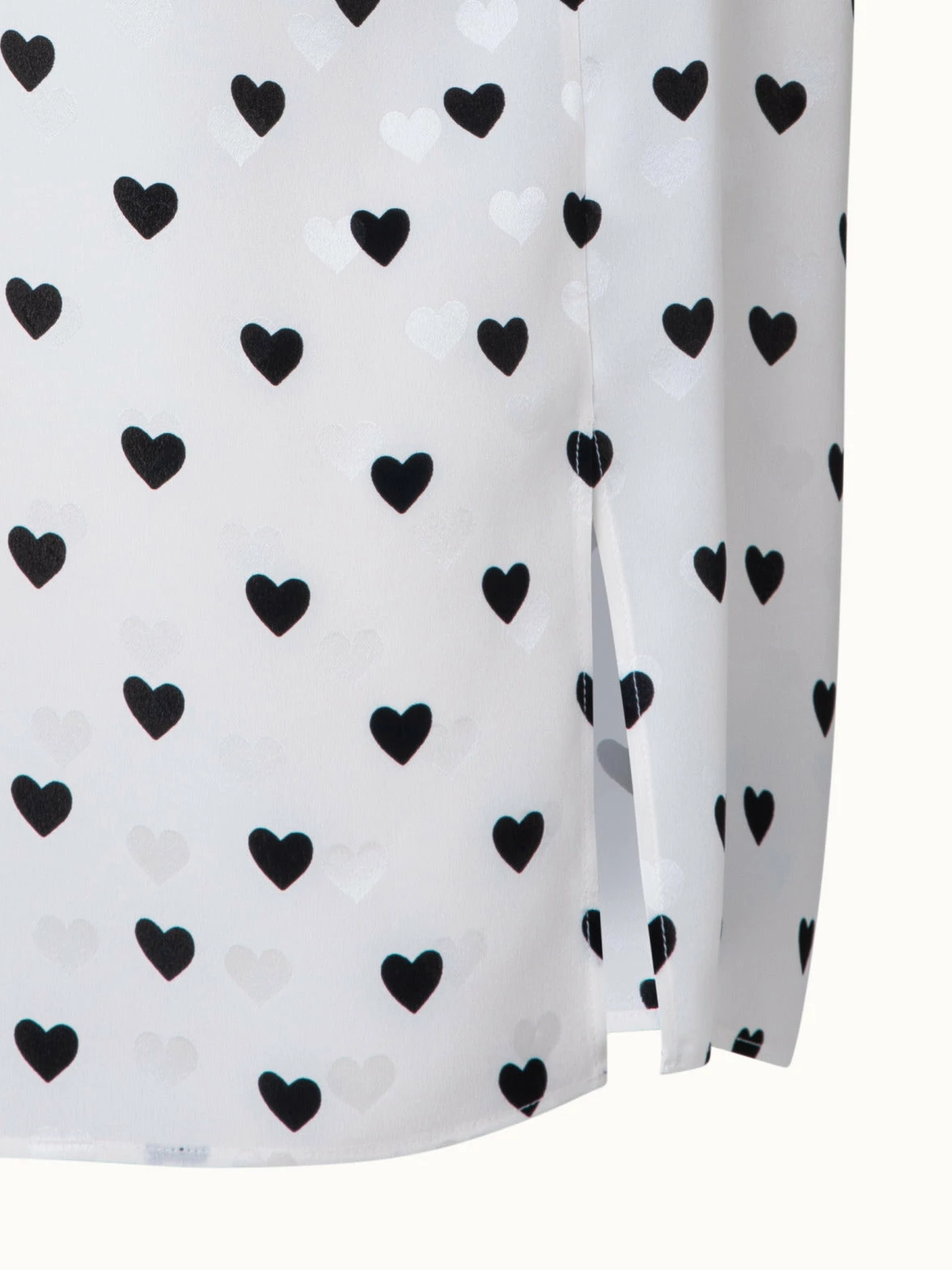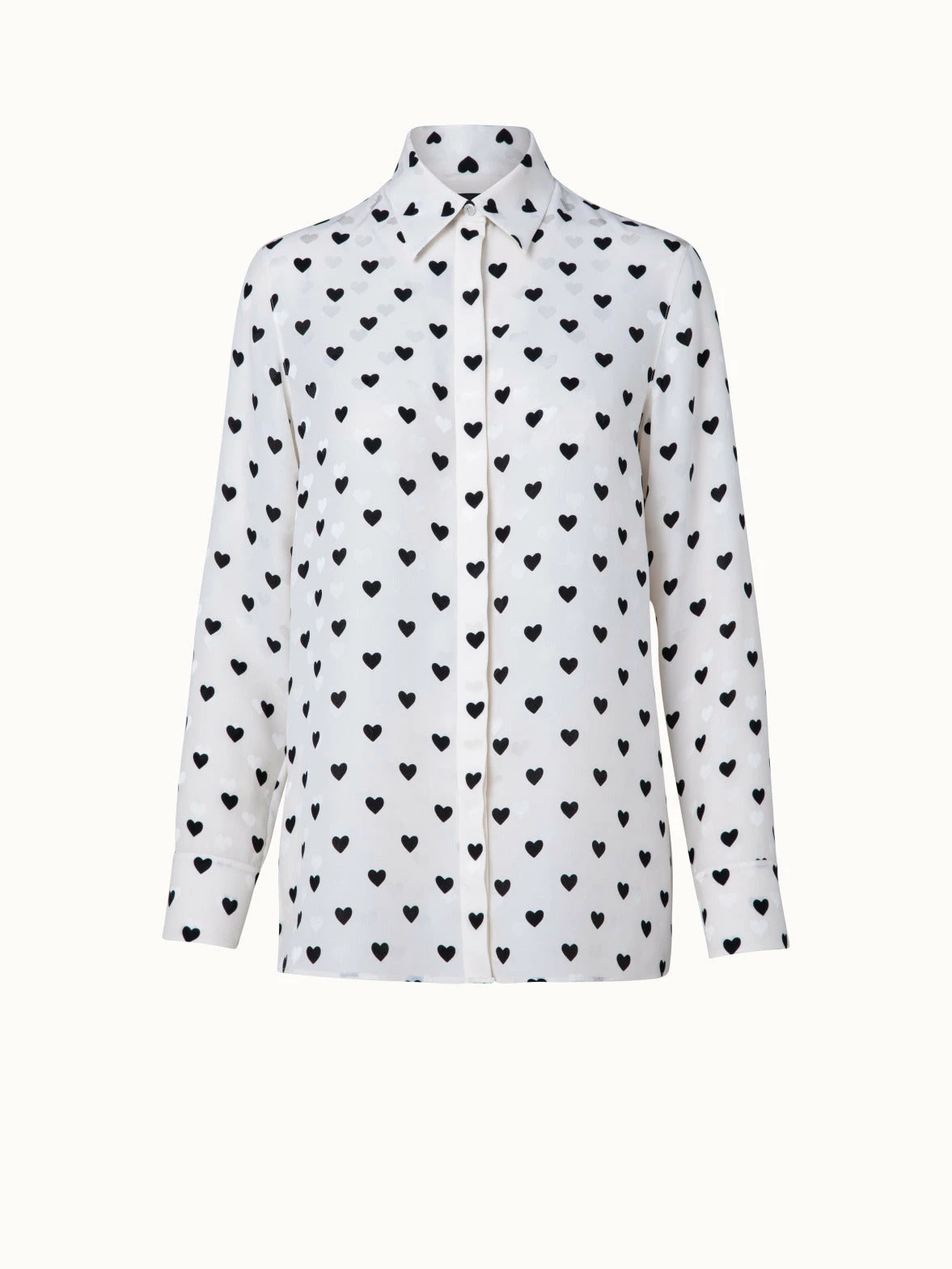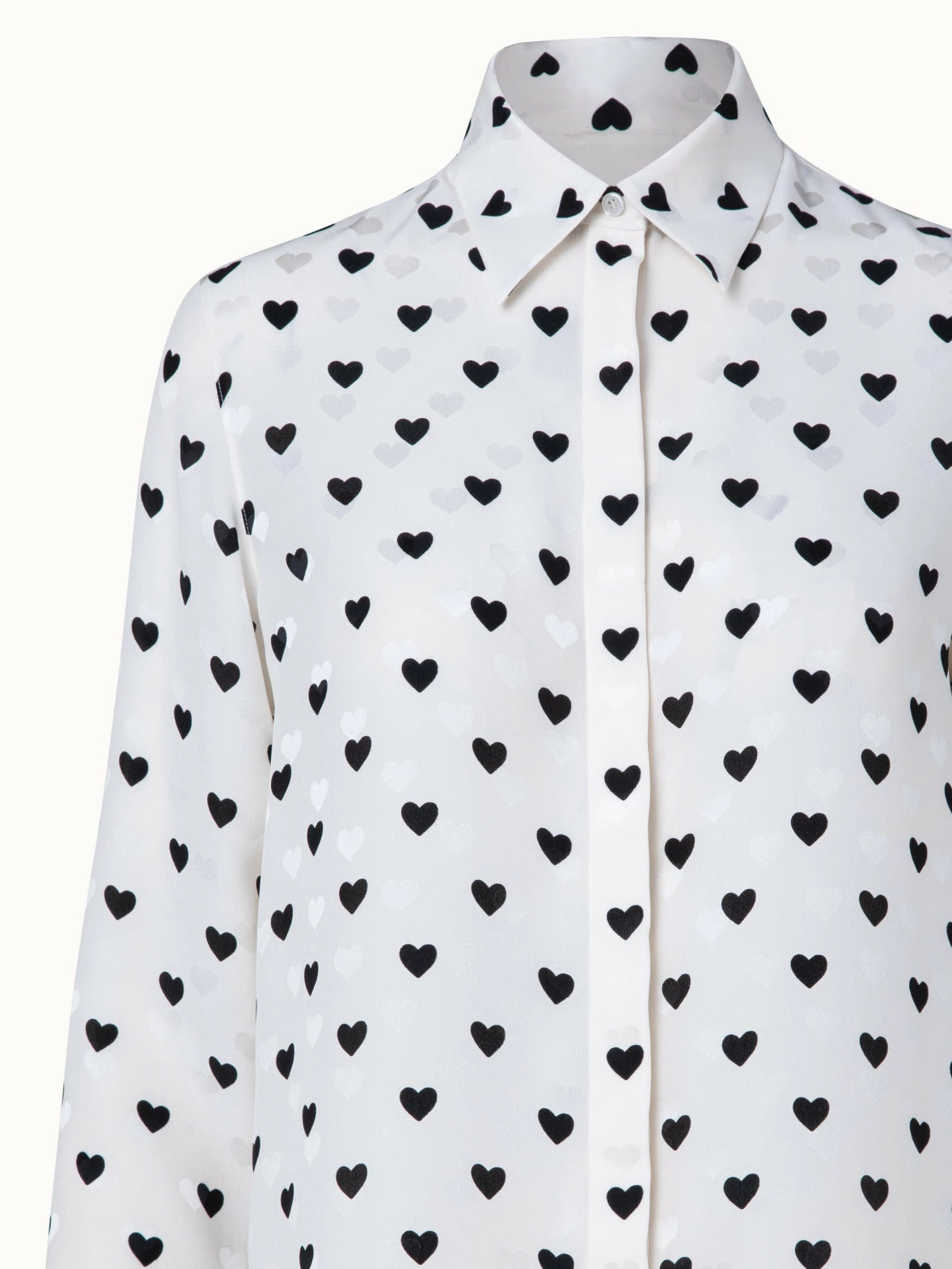 This Akris tunic blouse is crafted in silk crêpe with hearts print and jacquard. The shirt collar and covered button placket create a sleek and sophisticated look. The back pleat and side slits add an airy feel, making it perfect for spring and summer.