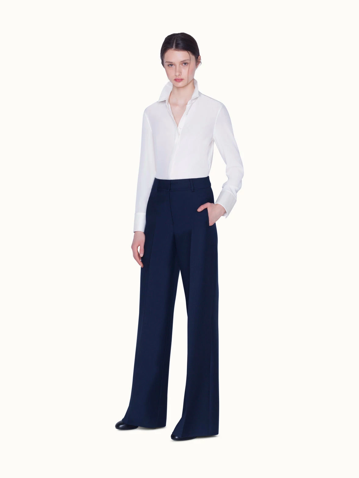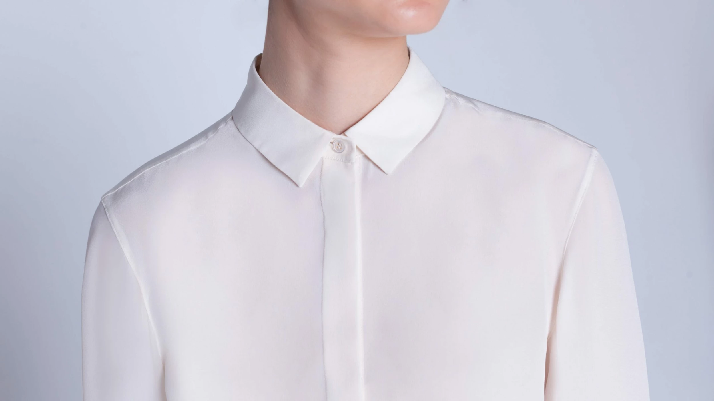 Blouse in silk satin, featuring a shirt collar, covered button panel and original horsehair cuffs