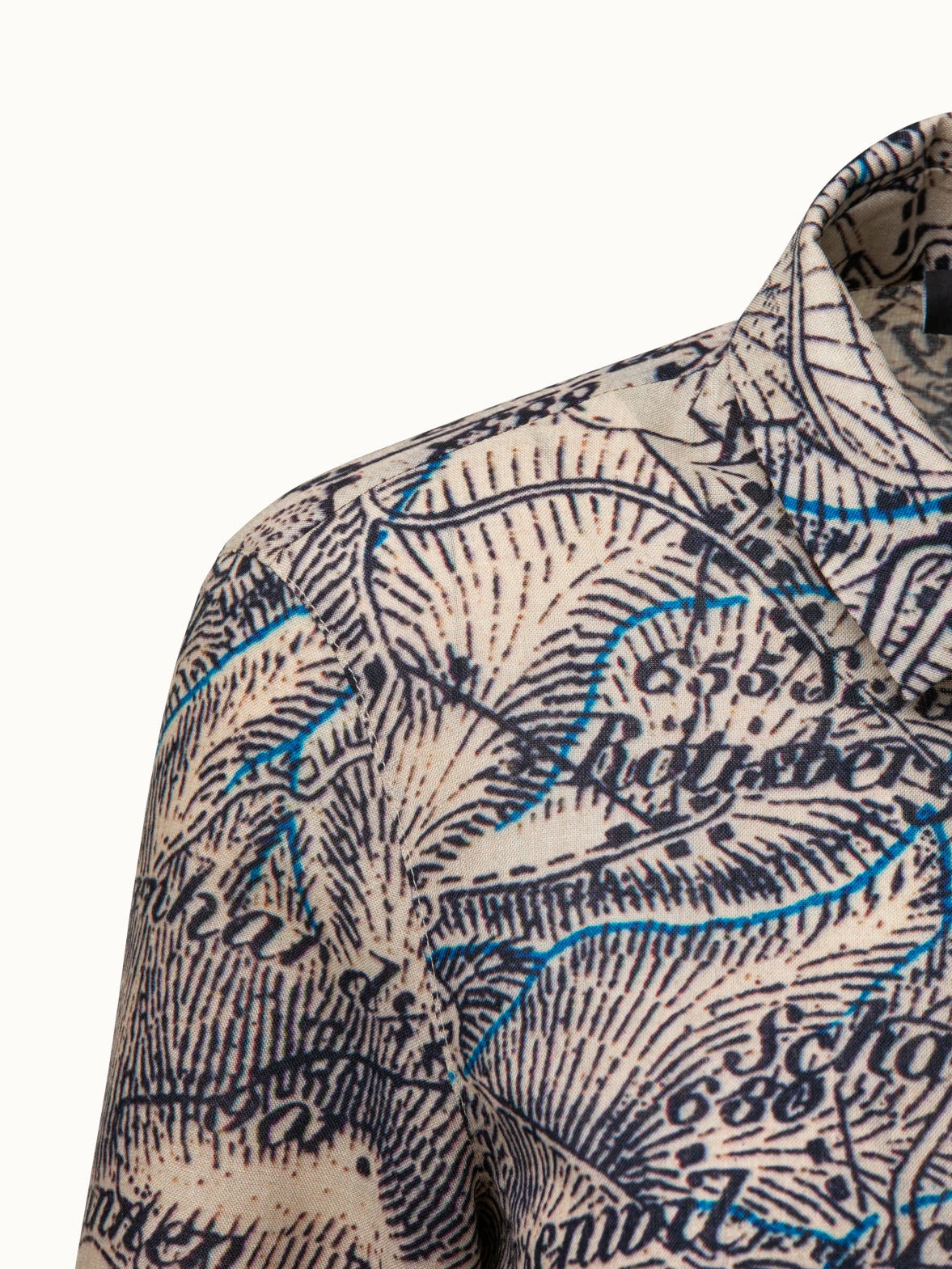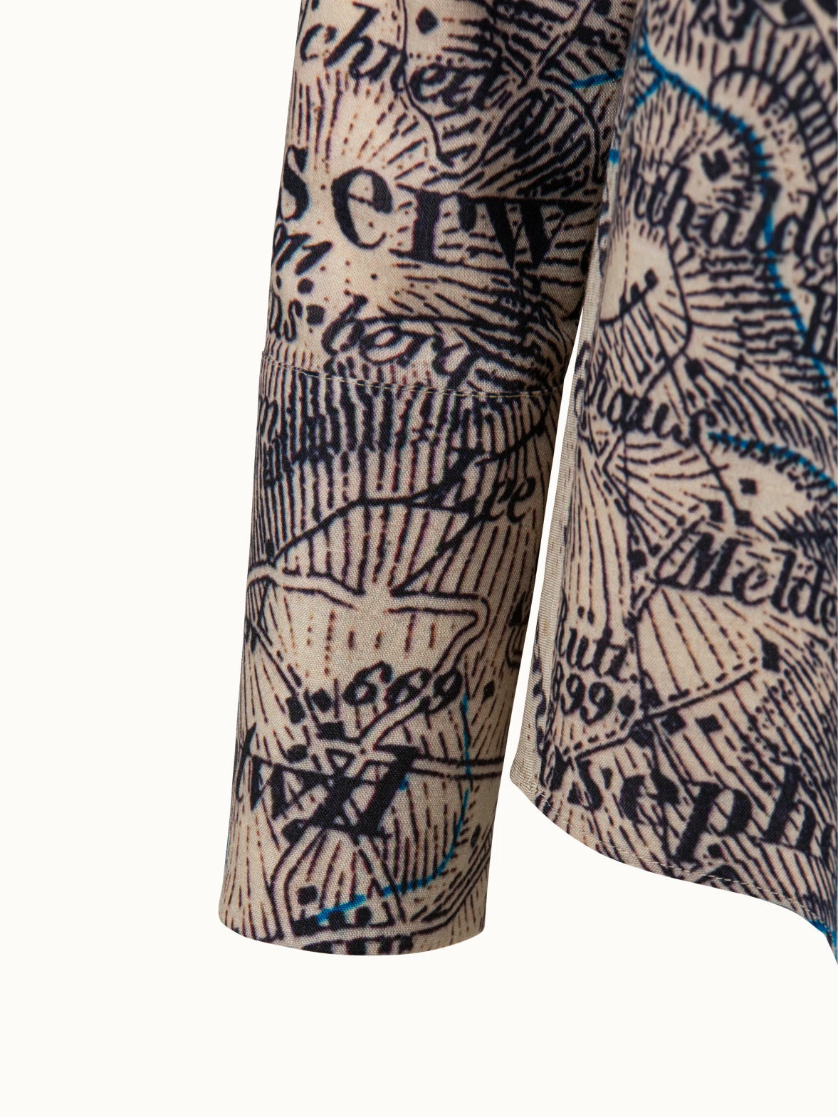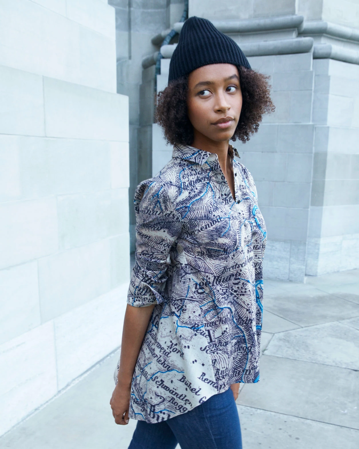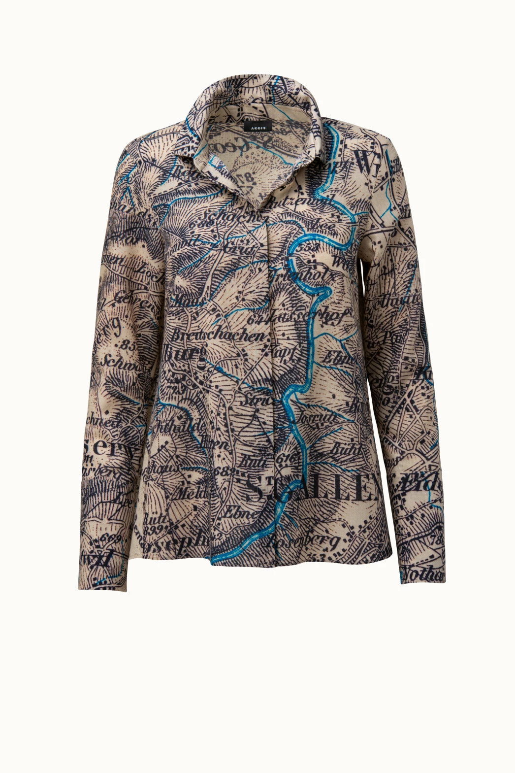 This fluid tunic blouse in a soft wool mousseline features the vintage St. Gallen map print. Complete with a shirt collar, button down front and an a-line hem for a slightly feminine shape.