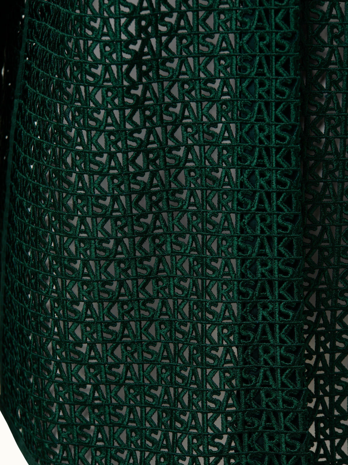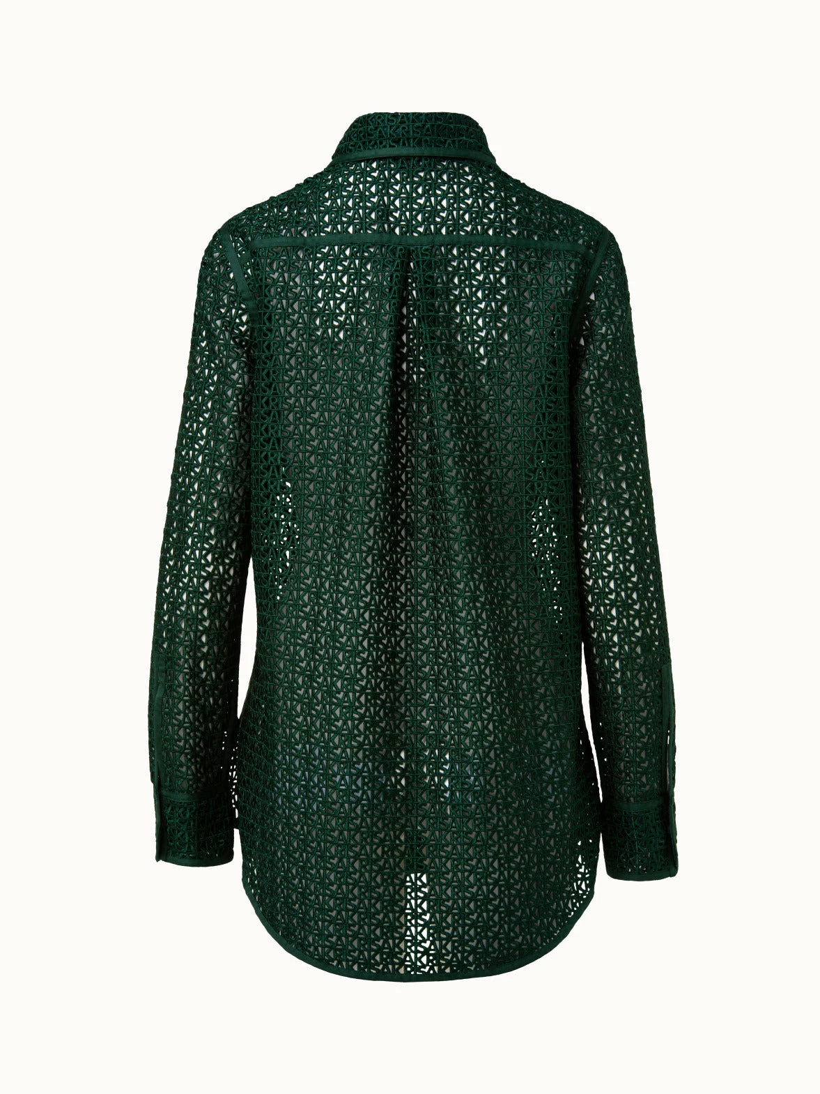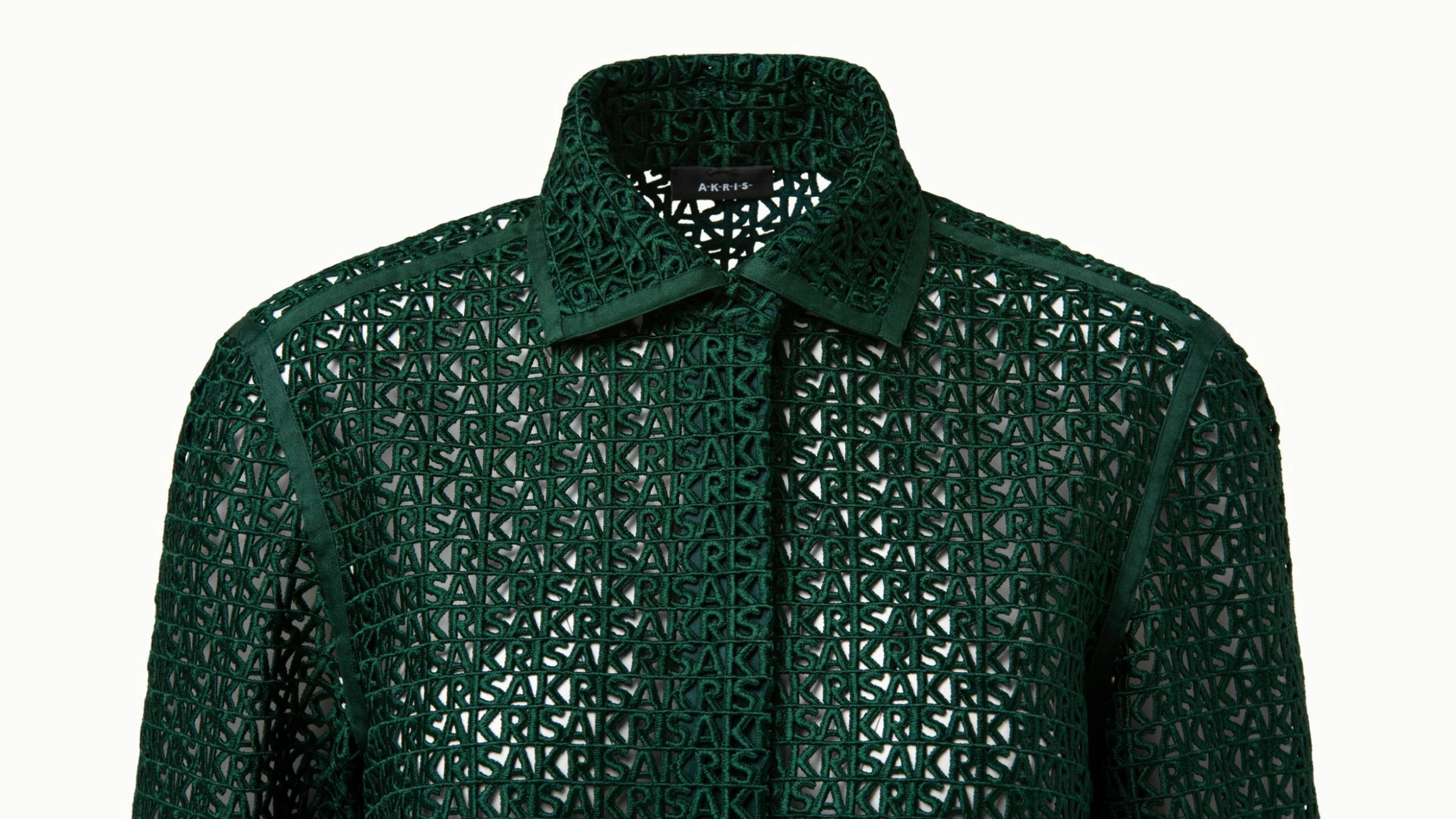 This tunic blouse crafted in allover Infinite embroidery-a subtle wink to the Akris letters- comes to life through a centuries-old technique that was invented in St.Gallen. With a shirt collar, button closure and longer back hemline, this blouse pairs wonderfully under our lamb suede jacket in gallus green.