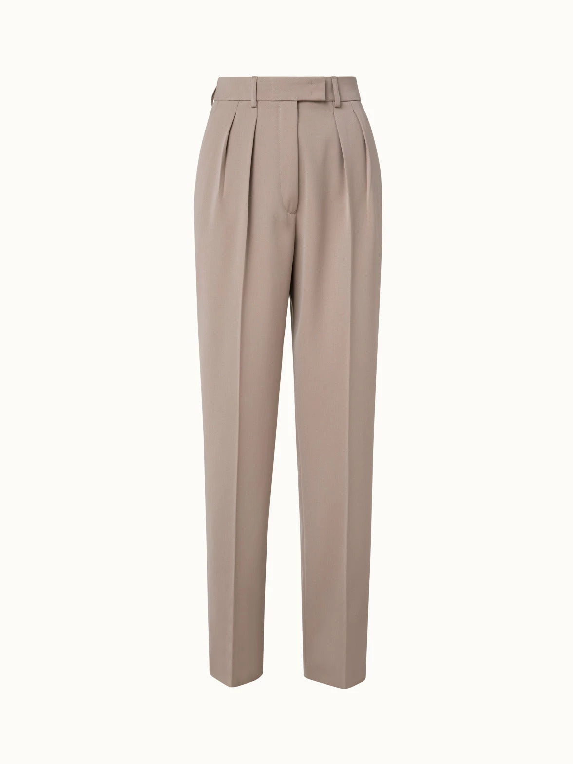 The Akris pants Fidelia are a revival of a vintage silhouette by creative director Albert Kriemler from the 1980s. It features a slightly tapered leg, creating a sleek shape. Waist pleats are a tailoring detail that ensures comfort while adding structure. These Akris Fidelia pants are crafted in wool gabardine, ideal for year-round wear.